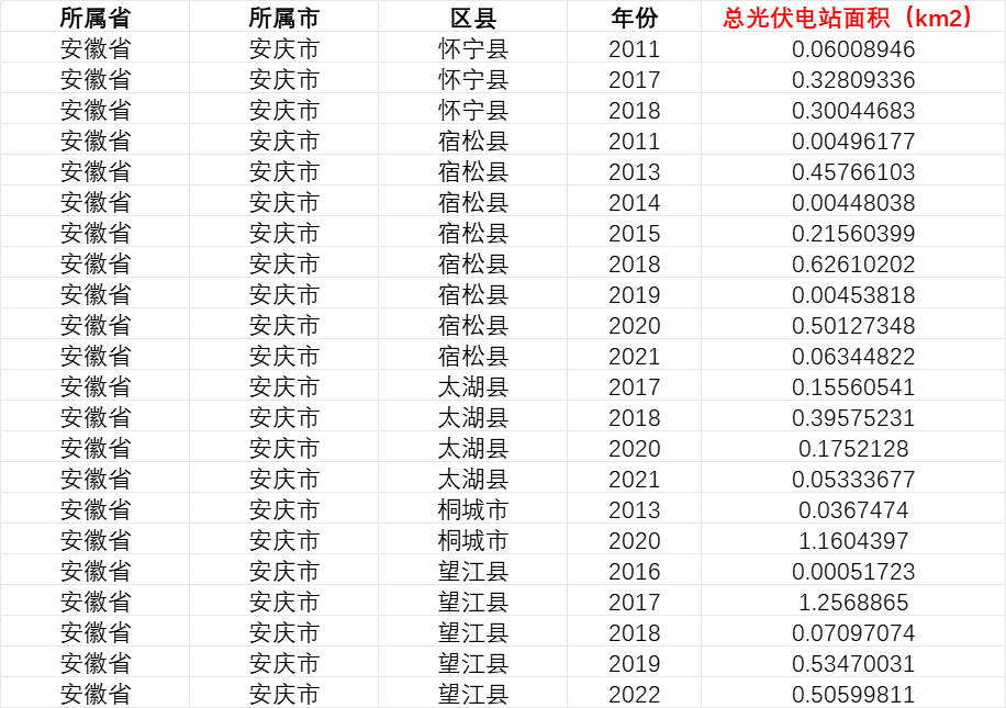 核心变量:总光伏电站面积(单位:km²),配套行政代码、年份等标识信息