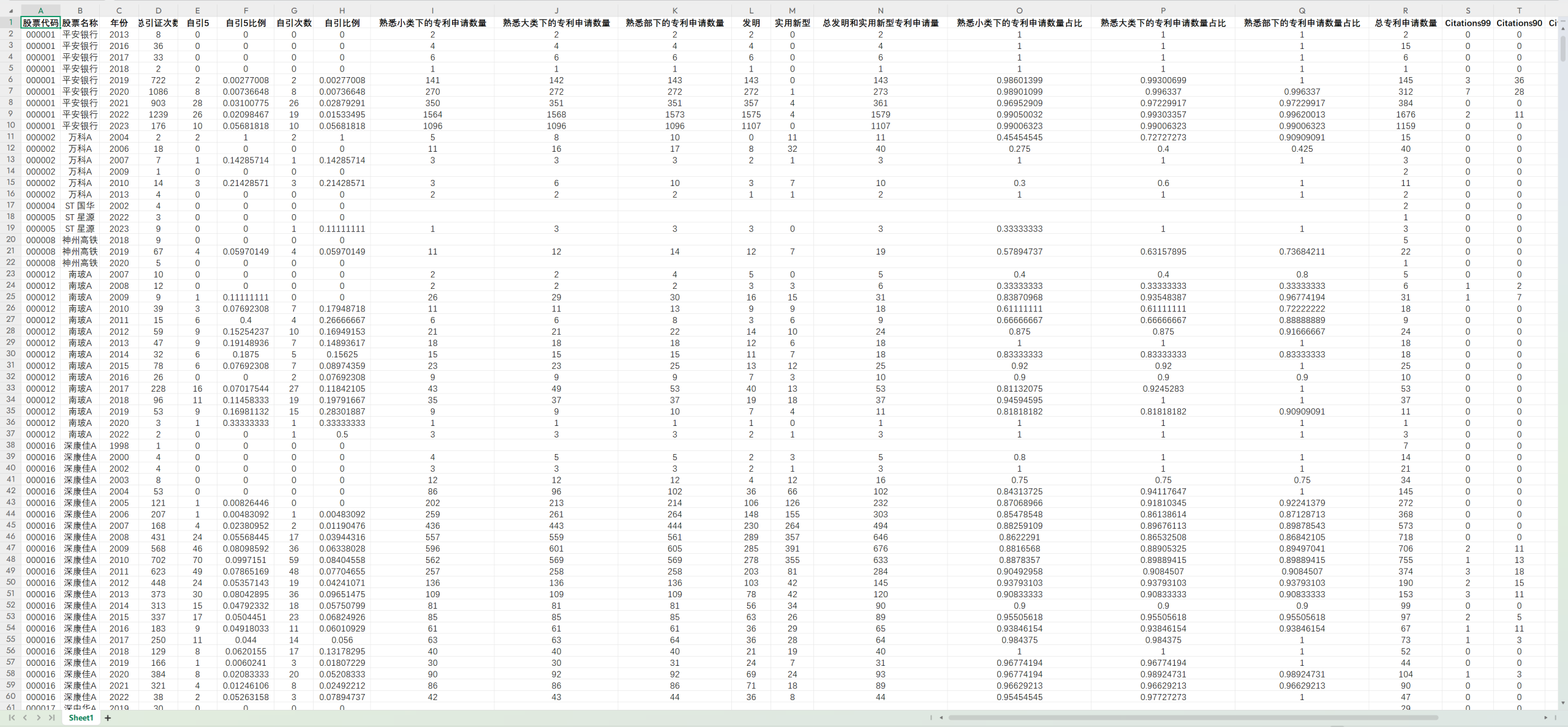 时间跨度与覆盖范围:涵盖 1985-2024 年上市公司专利数据,包含总引证次数、发明专利申请量、实用新型专利申请量等基础数据,以及衍生计算的各类比例指标。