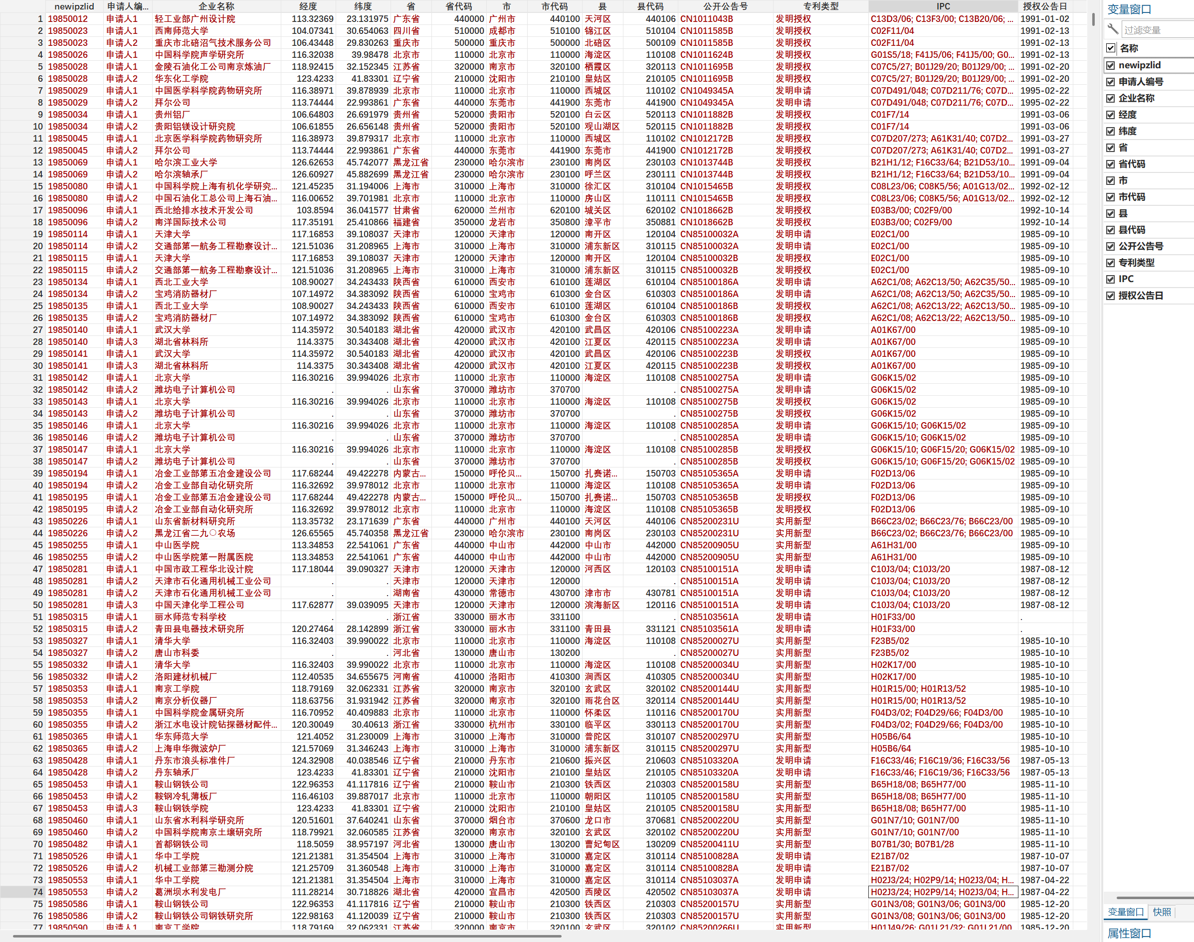 核心变量:包含 newipzlid(专利关联 ID)、申请人编号、企业名称、经纬度、省市区县代码、公开公告号、专利类型、IPC 分类、授权公告日等关键字段。