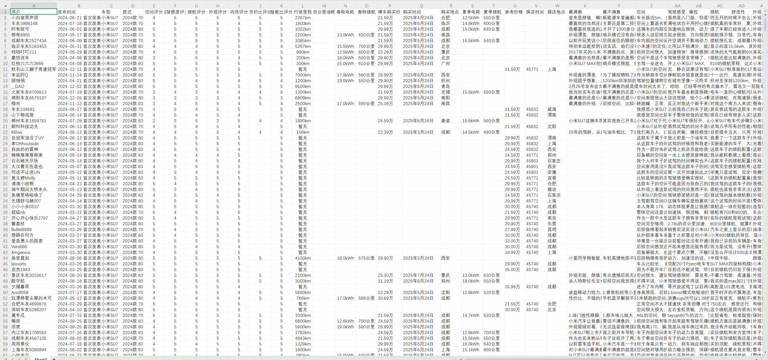 数据指标:用户、发布时间、车型、款式、空间评分、驾驶感受评分、续航评分、外观评分、内饰评分、性价比评分、智能比评分、行驶里程、百公里油耗、春秋电耗、春秋续航、裸车购买价、购买时间、购买地点、夏季电耗、夏季续航、参考价格、探店时间、探店地点、最满意、最不满意、空间、驾驶感受、操控、续航、舒适性、外观、内饰、性价比、智能化、选择这款车的理由、新车好评、新车槽点、价格政策、地址。
