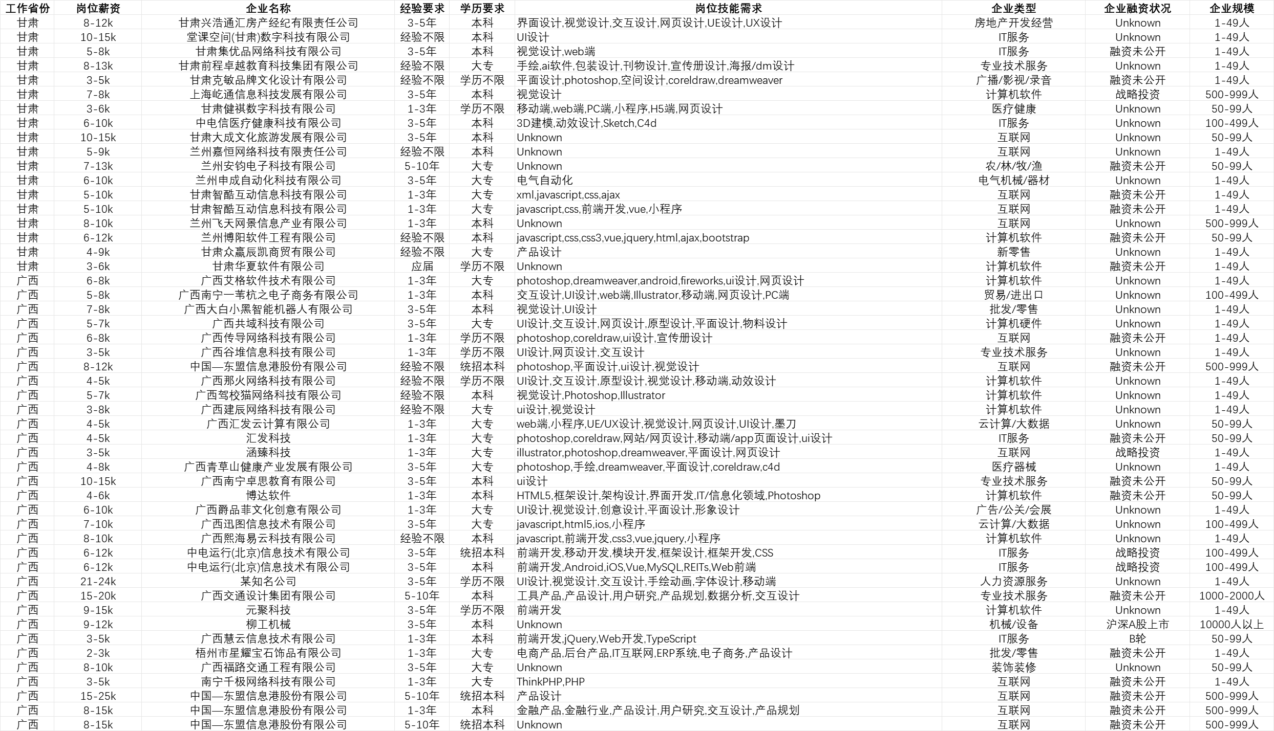 工作省份、岗位薪资、企业名称、经验要求、学历要求、岗位技能需求、企业类型、企业融资状况、企业规模。