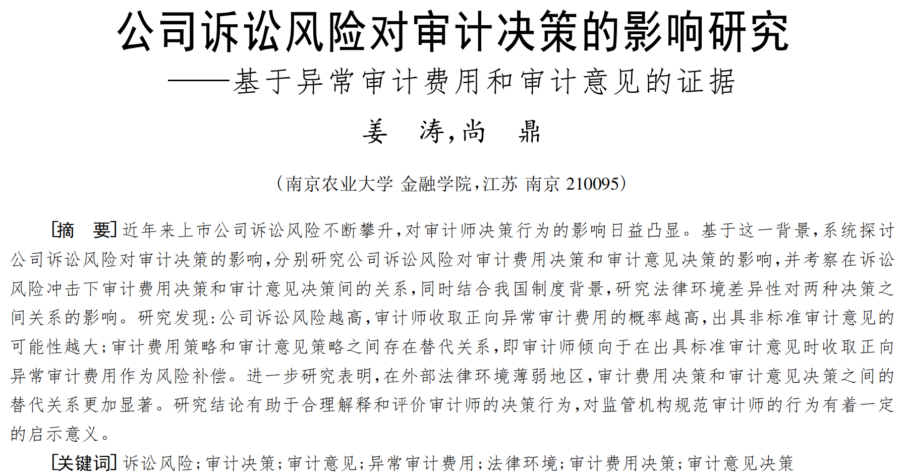 参考文献:[1]姜涛,尚鼎.公司诉讼风险对审计决策的影响研究——基于异常审计费用和审计意见的证据[J].南京审计大学学报,2020,17(03):13-22.