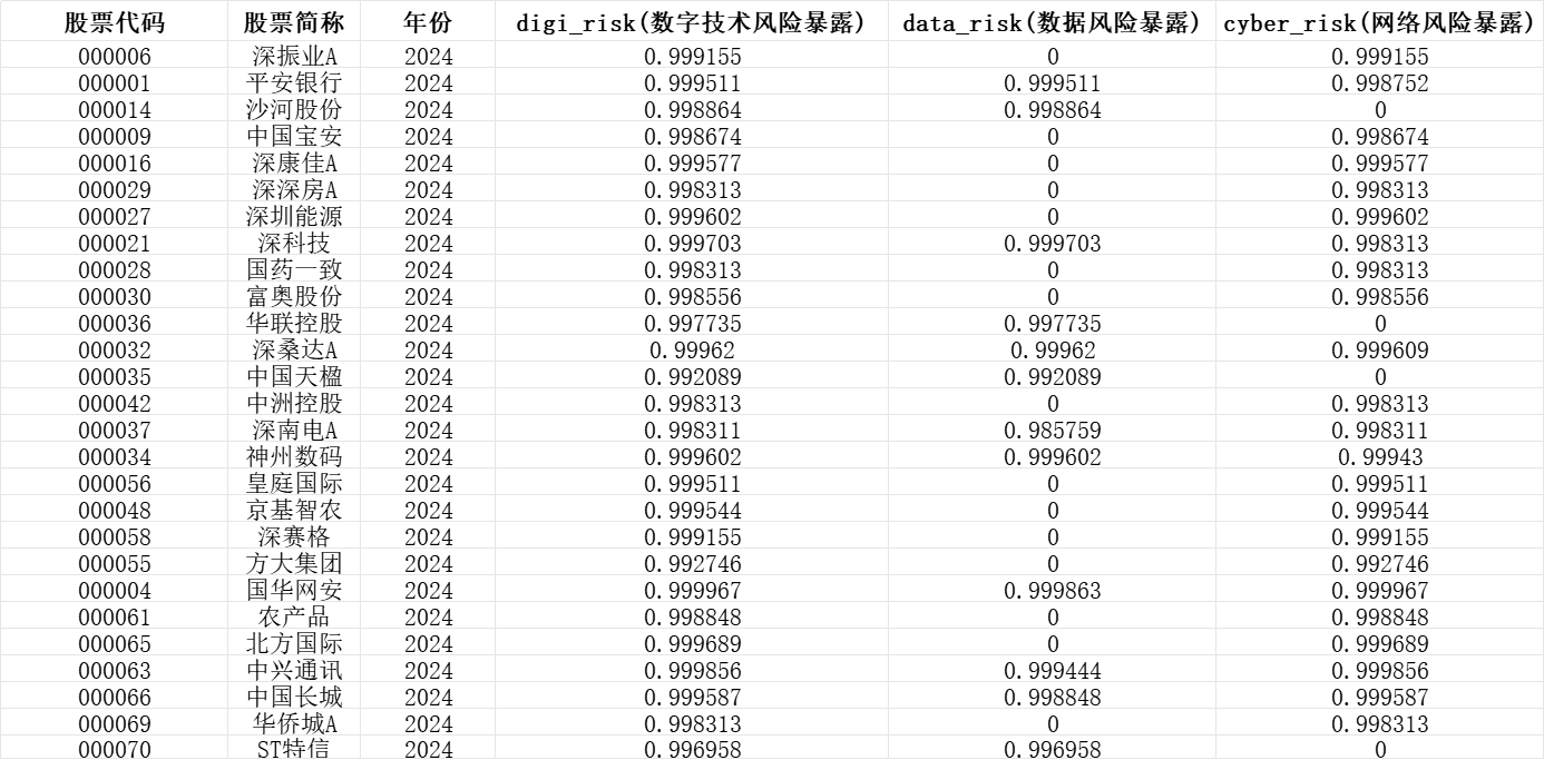 数据风险暴露:针对企业MD&A部分中涉及数据风险的文本,采用与数字技术风险暴露一致的计算逻辑,即通过“负面文本负面情感概率最大值 – 正面文本正面情感概率平均值”得出结果。
