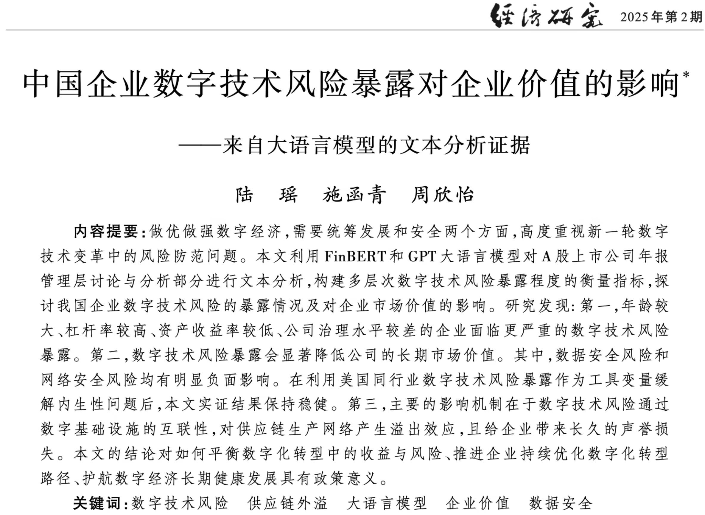 测算方法参考了《经济研究》期刊中陆瑶等学者(2025)的研究思路,在其基础上结合研究需求进行了方法优化。具体测算路径以 FinBERT 大语言模型为核心工具,通过对企业年度报告中与数字技术安全相关的论述开展文本情感识别,最终构建出企业—年份层面的三维度数字技术风险指标。