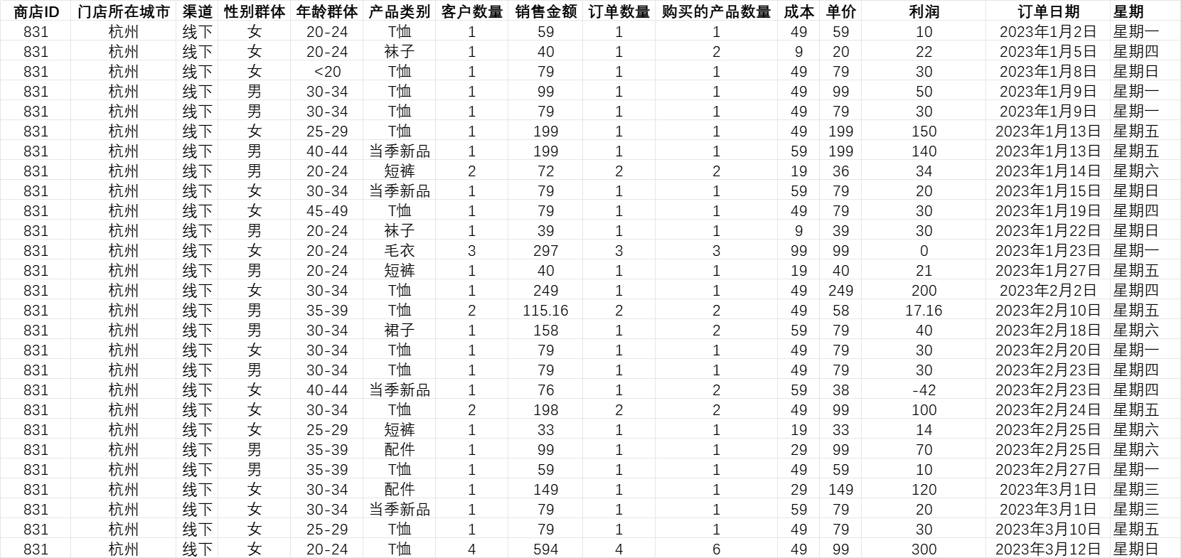 时间范围:2023年1月~2023年12月 样本数量:18950条 数据指标:商店ID、门店所在城市、渠道、性别群体、年龄群体、产品类别、客户数量、销售金额、订单数量、购买的产品数量、成本、单价、利润、订单日期、星期。