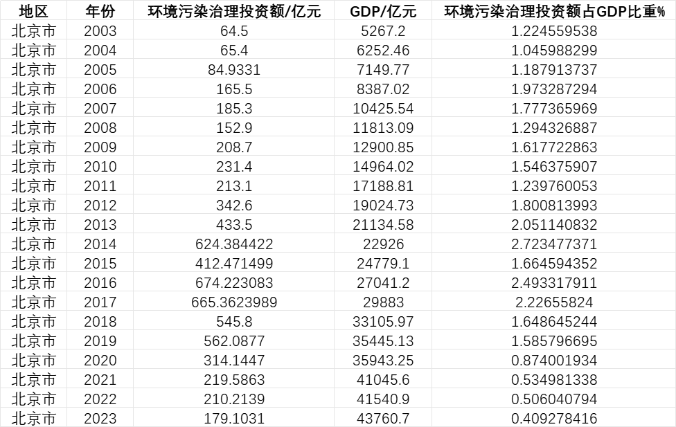 :地区、年份、环境污染治理投资额(单位:亿元)、GDP(单位:亿元)、环境污染治理投资额占GDP比重(%)。