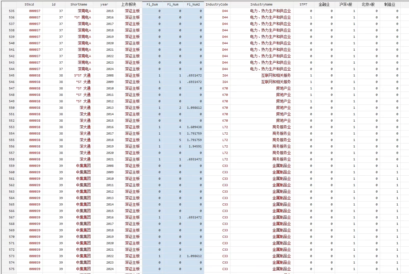 共 56,410 条观测值,全部A股上市公司。复刻了《会计研究》《世界经济》《经济管理》等顶刊的核心被解释变量。比如,2013年企业发生违规行为却于2021年查出,则该企业违规行为属于2013年,而非2021年。原始数据、最终结果(Excel和Dta)、参考文献。 数据指标: Fi_Dum:企业当年是否违规,1是0否。约有17.5%的企业发生了违规行为。 Fi_Num:企业当年的违规次数。 Fi_Num2:企业当年违规次数的自然对数。