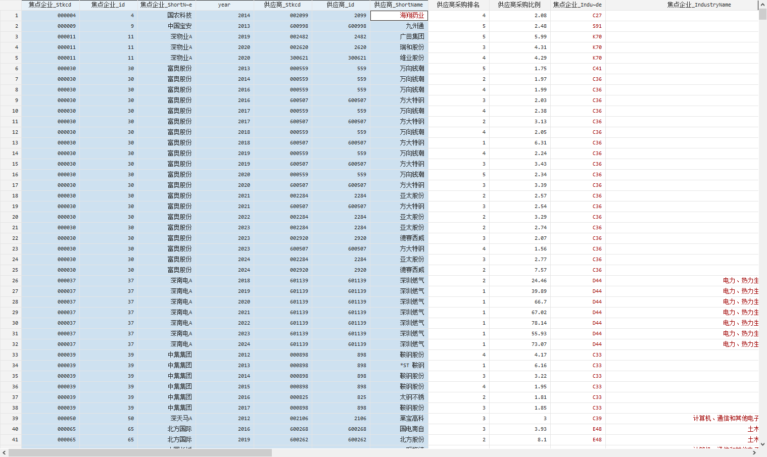 焦点企业的行业名称及行业代码,供应商的行业名称及行业代码