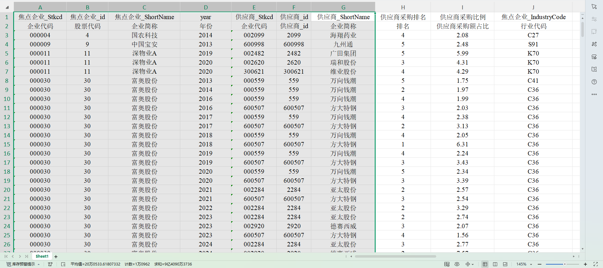 焦点企业的企业代码,供应商的企业代码