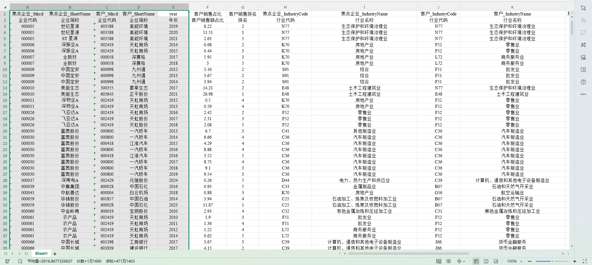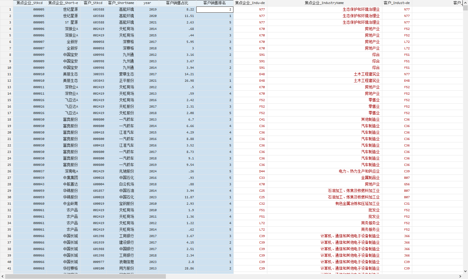 焦点企业的行业名称及行业代码,客户的行业名称及行业代码
