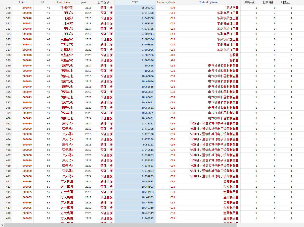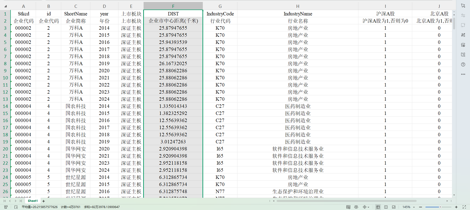 共 40,759 条观测值,已剔除数据缺失或异常、金融业、STPT的观测值,已缩尾。来源CSMAR,由于企业地址变更或数据库统计谬误,因此可能存在一定的误差。 核心指标: 企业市中心距离:企业到市中心的直线距离,单位千米。
