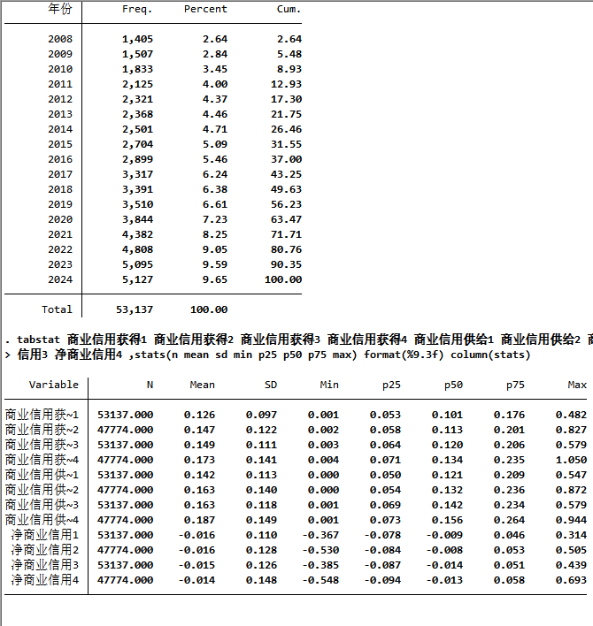 本研究的样本区间划定为 2008-2024 年,以全部上市公司为研究对象,经数据筛选后最终得到 53,137 条 有效观测值。为确保研究数据的准确性与可靠性,本研究依次开展以下预处理工作:剔除存在数据缺失或异常的样本、金融业上市公司样本,以及被实施 ST/PT 特别处理的上市公司样本;同时对连续变量进行缩尾处理,以削弱极端值对研究结果的潜在干扰。