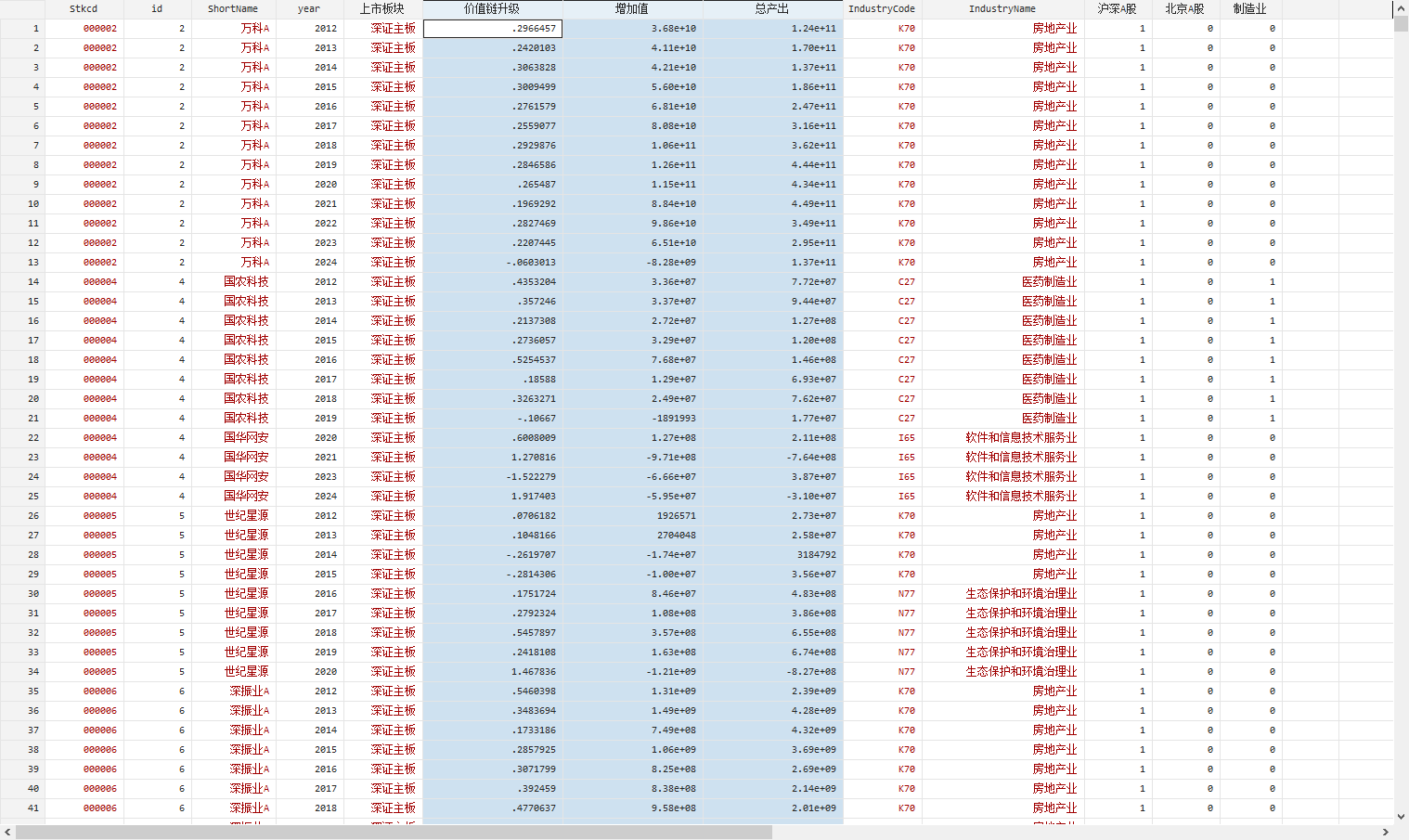 2012 – 2024 年,共 46,268 条观测值,全部A股上市公司。已剔除数据缺失或异常、金融业、STPT的观测值,已缩尾。来源CSMAR,参考《湖南科技大学学报》进行计算。附Excel版本、Dta版本、参考文献。 核心指标: 企业产业链升级:等于企业工业增加值与总产出的比值,值越大,企业产业链升级水平越高 增加值 总产出:等于增加值与购买商品接受劳务支付的现金的和