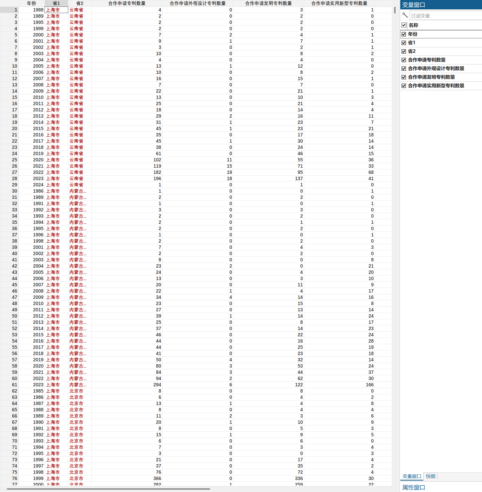 数据的核心价值在于 “全维度覆盖” 与 “高精度细分”:时间上贯穿 40 年,见证从改革开放初期到创新强国建设的专利合作变迁;空间上实现省、市、区县三级穿透,小到区县间的局部协作,大到省份间的跨区域联动都清晰可查;类型上区分三类专利,能精准匹配不同研究场景 —— 无论是分析核心技术(发明专利)的跨区域流动,还是观察产业配套(实用新型专利)的协同布局,都能找到对应数据支撑。