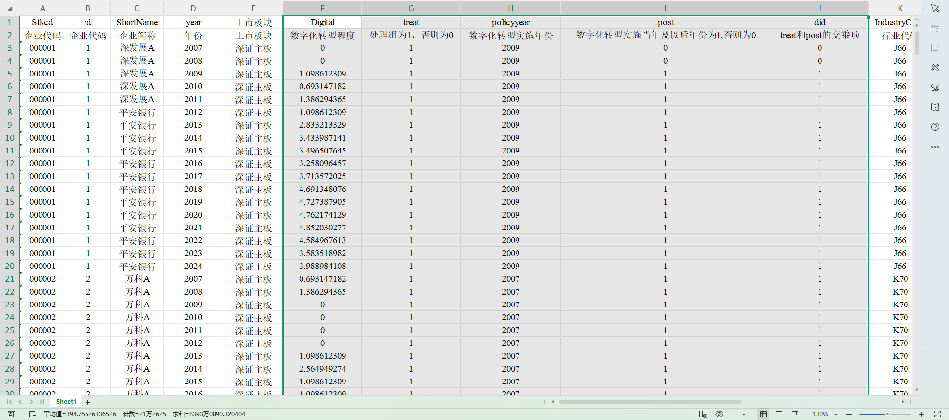 计算方法:参考《会计研究》《管理评论》,构建多期双重差分法克服内生性问题。根据文献方法,已剔除样本期间一直出现数字化词频的样本,已剔除年份少于5年的样本。