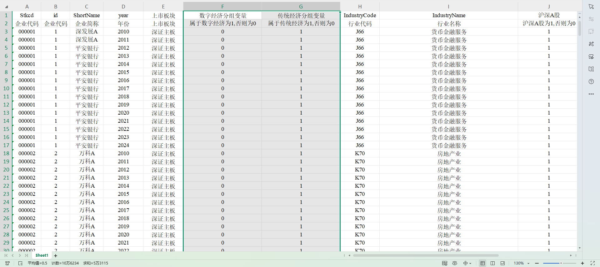 2010 – 2024 年,共 53,115 条观测值,Excel版本、Dta版本、参考文献。 计算方法:参考《经济研究》,将计算机、通信和其他电子设备制造业和软件和信息技术服务业作为数字经济行业,将其余行业作为传统经济行业。 数据指标: 数字经济分组变量:企业属于数字经济行业则取值为1,否则为0 传统经济分组变量:企业属于传统经济行业则取值为1,否则为0