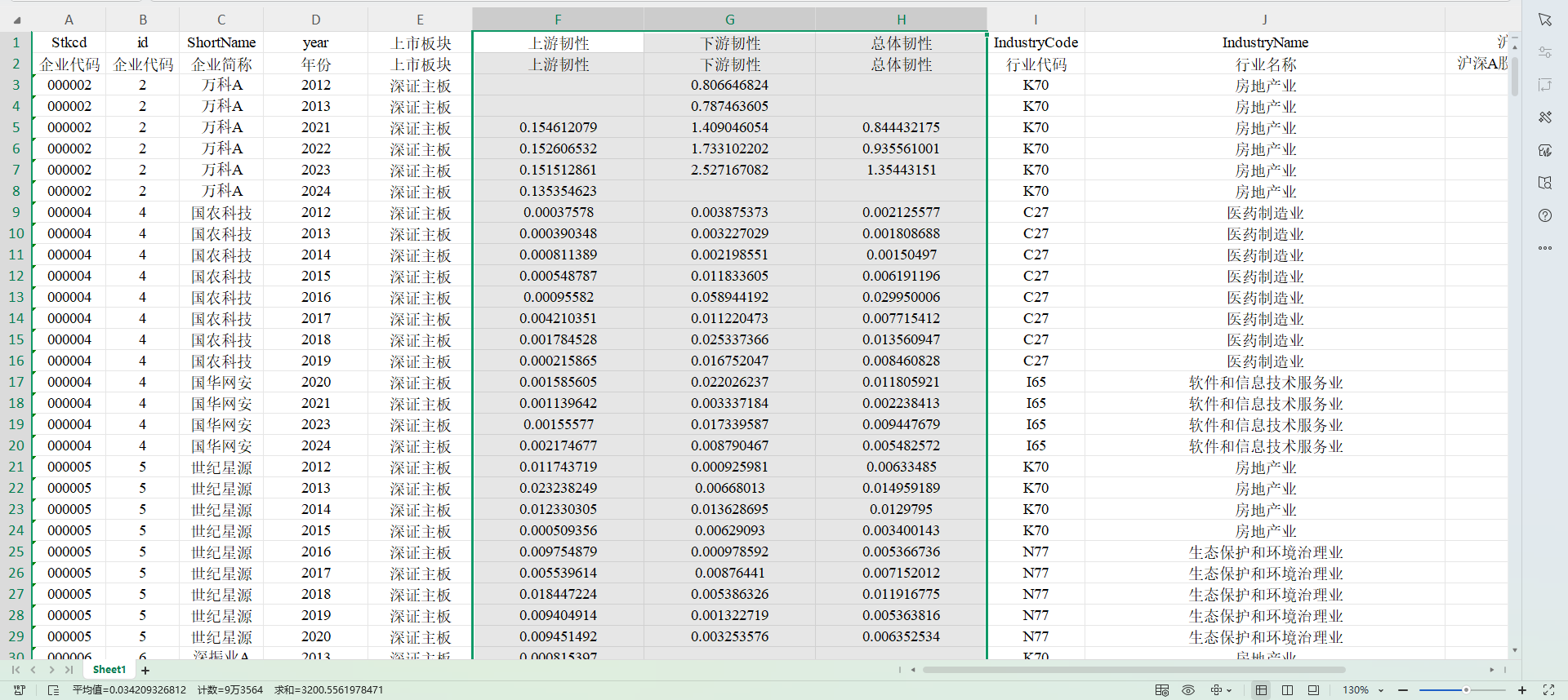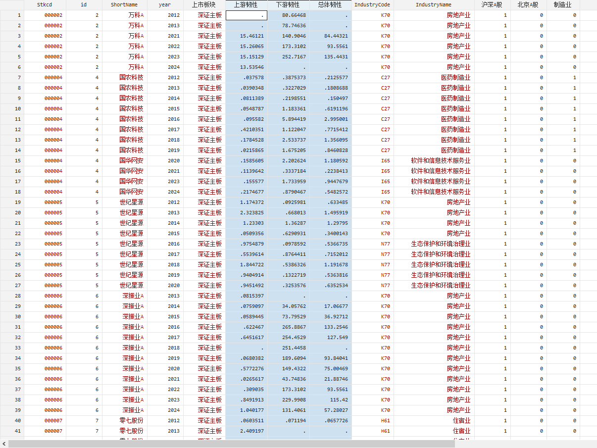 2012 – 2024 年,共 33,419 条观测值,已剔除数据缺失或异常、金融业、STPT的观测值,已缩尾。 数据指标: 上游韧性:企业前五大供应商的采购比例的赫芬达尔指数的倒数 下游韧性:企业前五大客户的销售比例的赫芬达尔指数的倒数 总体韧性:上游韧性与下游韧性取均值 上述指标值越大,企业产业链韧性越强