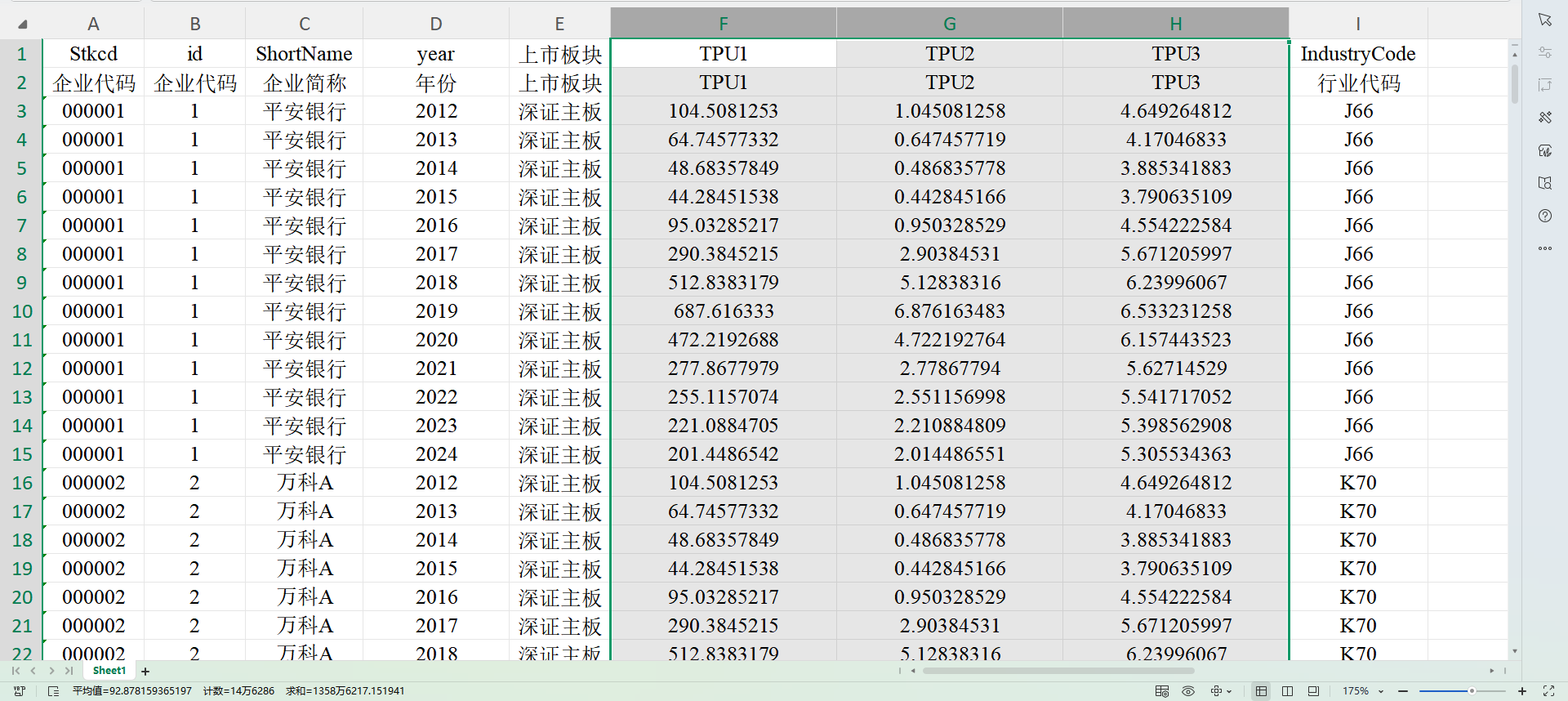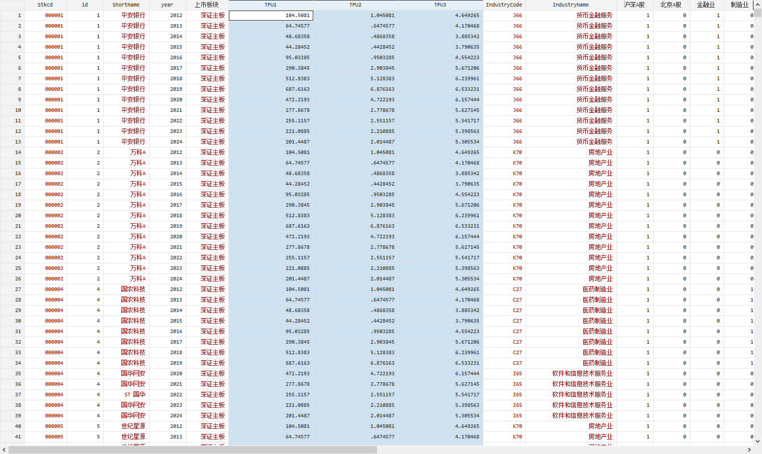 2012 – 2024 年,共 48,760 条观测值。来源:采用Davids基于《人民日报》《光明日报》所构建的贸易政策不确定性指数。 数据指标: TPU1:等于企业所在年份的贸易政策不确定性指数 TPU2:等于企业所在年份的贸易政策不确定性指数除以100 TPU3:等于企业所在年份的贸易政策不确定性指数取自然对数