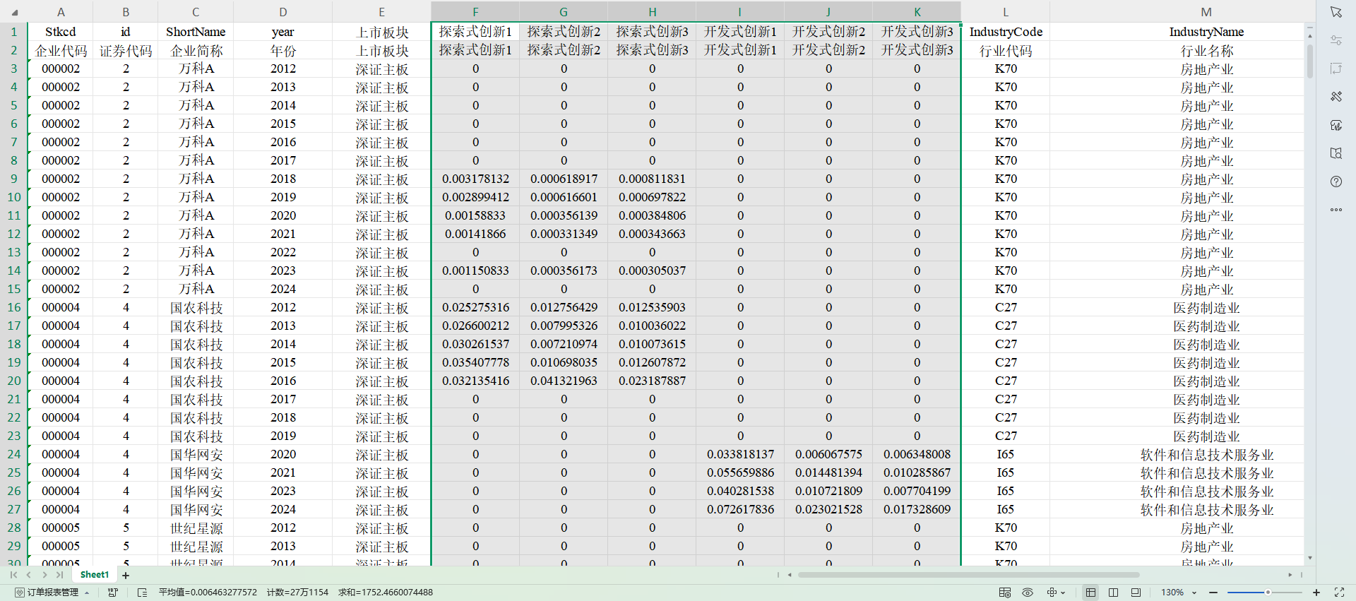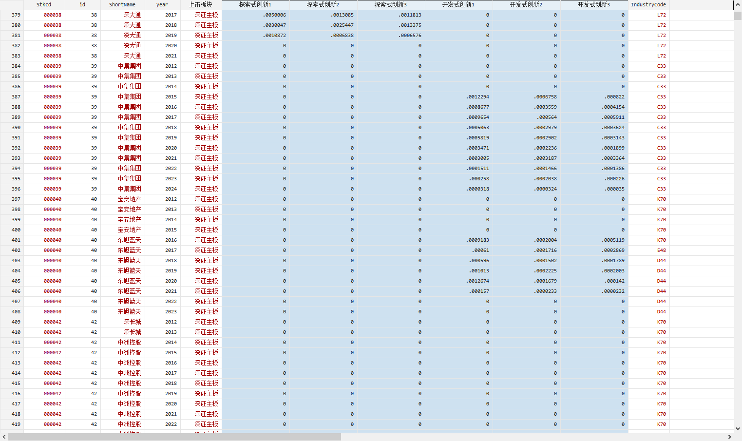 2012 – 2024 年,共 46,267 条观测值,已剔除数据缺失或异常、金融业、STPT的观测值,已缩尾。来源:CSMAR。Excel版本、Dta版本、参考文献。 数据指标: 探索式创新1:研究费用化支出与营业收入的比值 探索式创新2:研究费用化支出与总资产的比值 探索式创新3:研究费用化支出与期初总资产的比值 开发式创新1:研究资本化支出与营业收入的比值 开发式创新2:研究资本化支出与总资产的比值 开发式创新3:研究资本化支出与期初总资产的比值