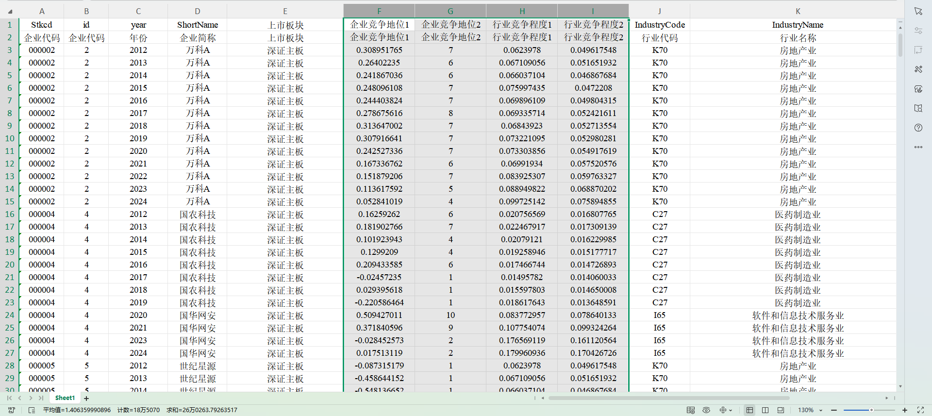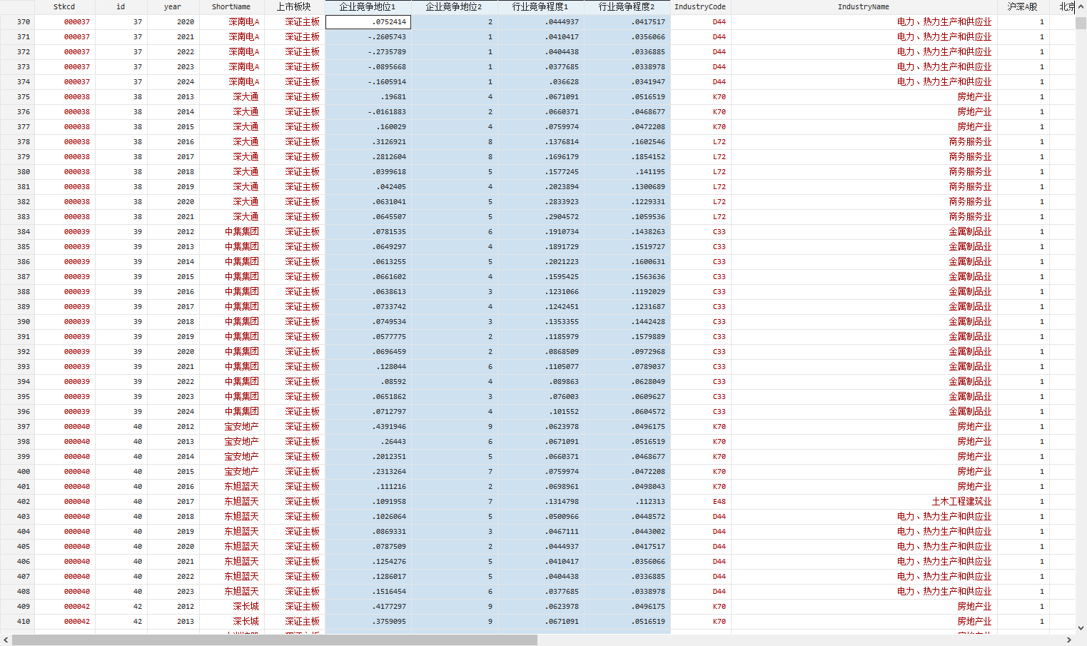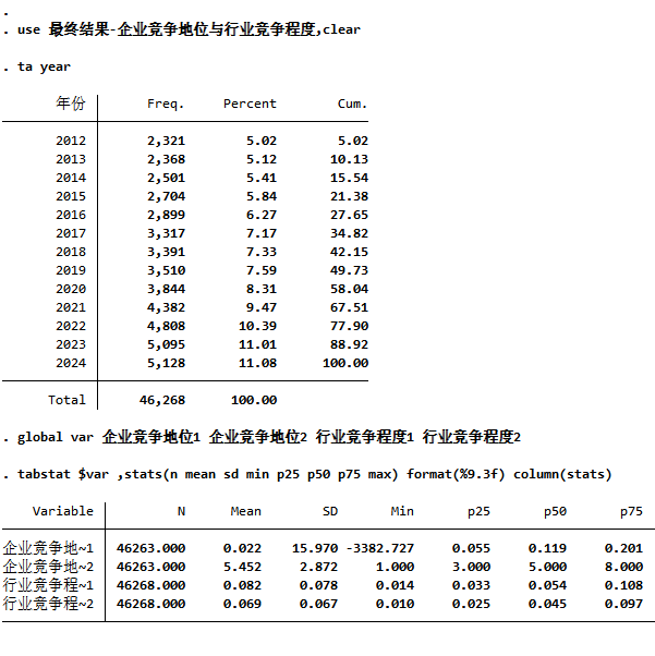 2012 – 2024 年,共 46,268 条观测值,已剔除数据缺失或异常、金融业、STPT的观测值,没缩尾。来源:CSMAR。 数据指标: 企业市场竞争地位1:等于勒纳指数 企业市场竞争地位2:分年度分行业对勒纳指数由小到大进行排序并平均分为10组,并按1-10进行赋值 上述值越大,企业市场竞争地位越高 行业竞争程度1:由营业收入计算的赫芬达尔指数 行业竞争程度2:由总资产计算的赫芬达尔指数 上述值越小,行业竞争程度越大