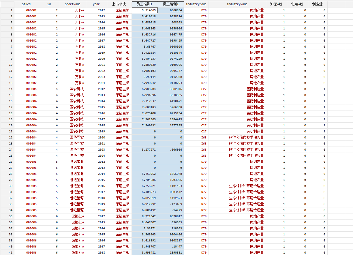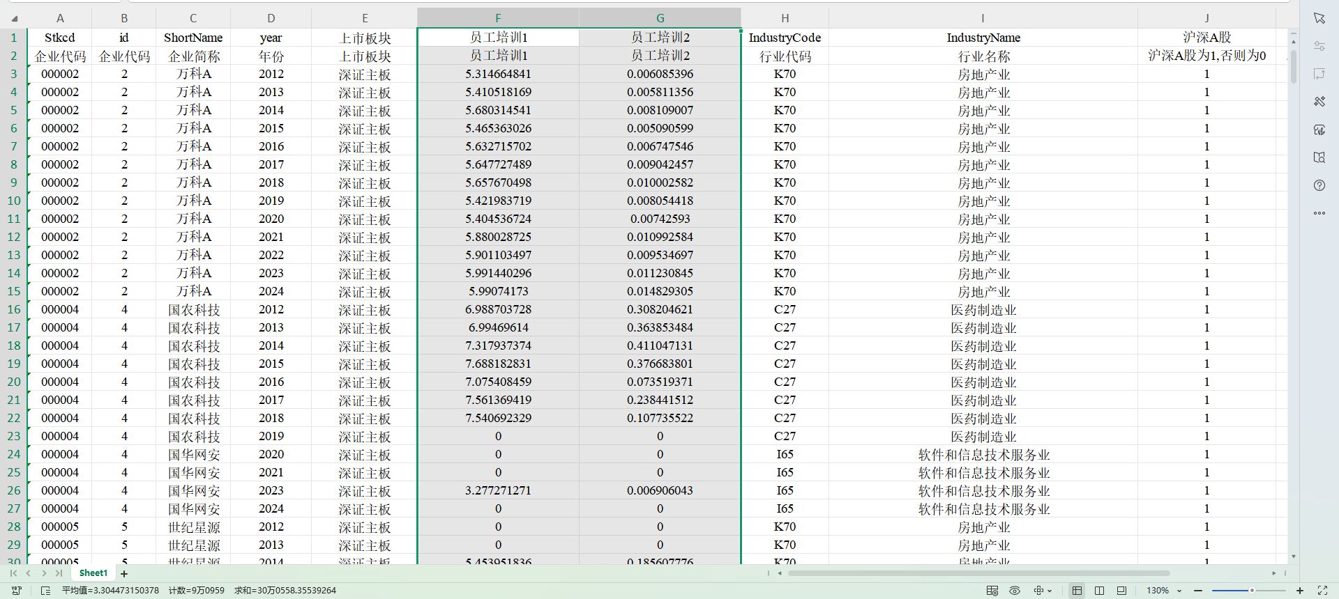 2012 – 2024 年,共 45,509 条观测值,全部A股上市公司,已剔除数据缺失、STPT、金融业的观测值,已缩尾。来源:CSMAR。结果(Excel和Dta)和参考文献。 指标: 员工培训1:员工培训费用与员工人数的比值,再取自然对数 员工培训2:员工培训费用与营业收入的比值(百分比) 上述指标值越大,企业员工培训力度越大