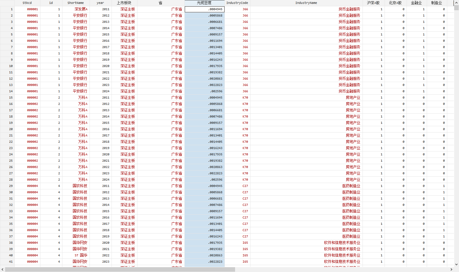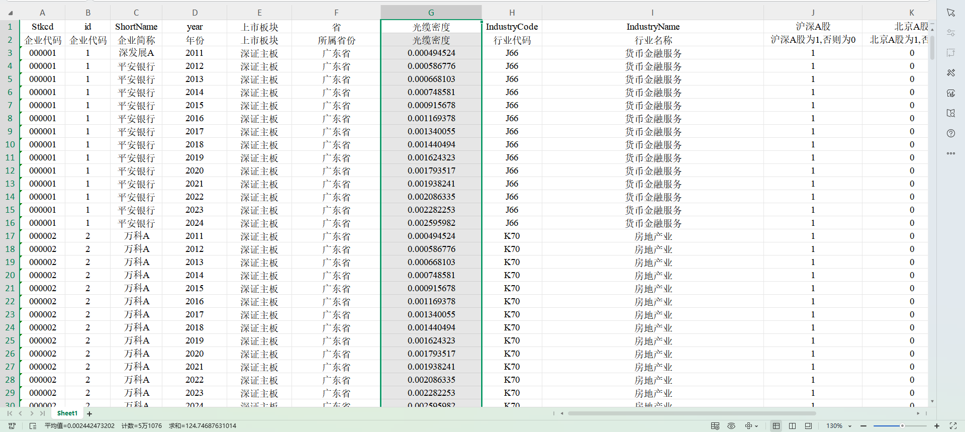 2011 – 2024 年,共 51,074 条观测值,全部A股上市公司,已剔除数据缺失的观测值,没缩尾。说明:24年数据由往年数据进行填补所得。来源:CSMAR。 指标: 光缆密度:企业所在省份的光缆长度(千米)与省份区域面积(平方千米)的比值,参考 7 篇 CSSCI 而构建。