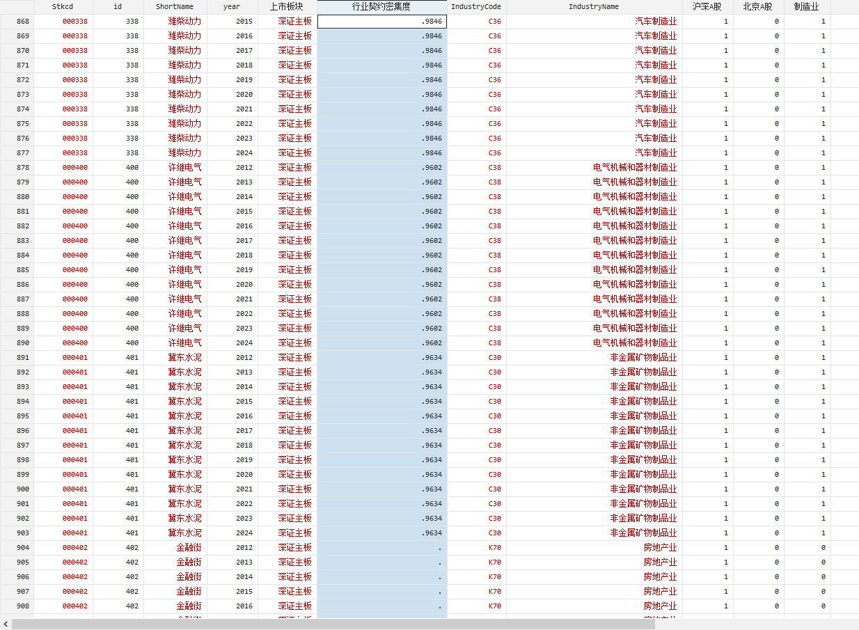 2012 – 2024 年,共 30,701 条观测值,全部A股上市公司,已剔除数据缺失或异常、金融业、STPT的观测值,没缩尾,Excel版本、Dta版本、参考文献。 计算方法:根据李坤望和王永进(2010)测度的28个制造业的行业契约密集度。 指标: 契约密集度:由李坤望和王永进(2010)测度。(该数据不随时间变化,只随行业变化。)
