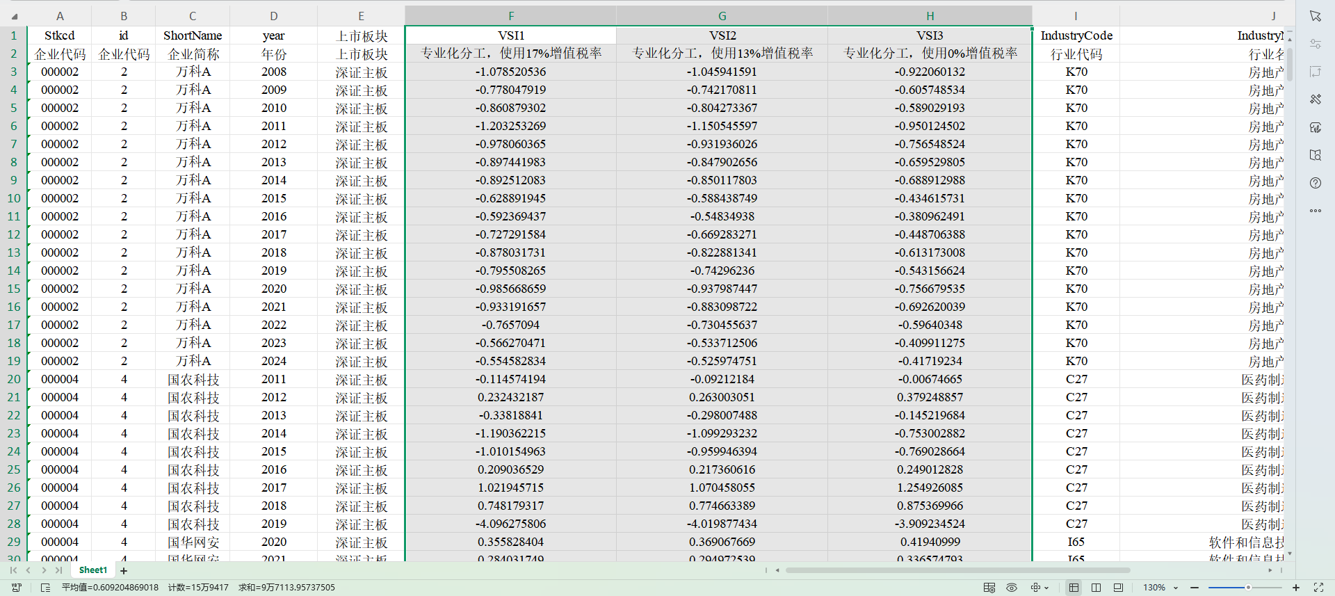 2008 – 2024 年,共 53,173 条观测值,全部A股上市公司,已剔除数据缺失、STPT、金融业的观测值,已缩尾。没有剔除VSI1大于1或小于0的观测值。已区分上市板块、是否沪深A股、是否北京A股。结果(Excel和Dta)、参考文献。