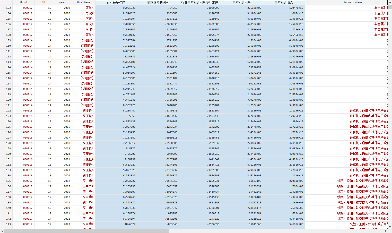 行业竞争程度:对行业主营业务利润率标准差取倒数,得到行业竞争程度,值越大,行业竞争越大。