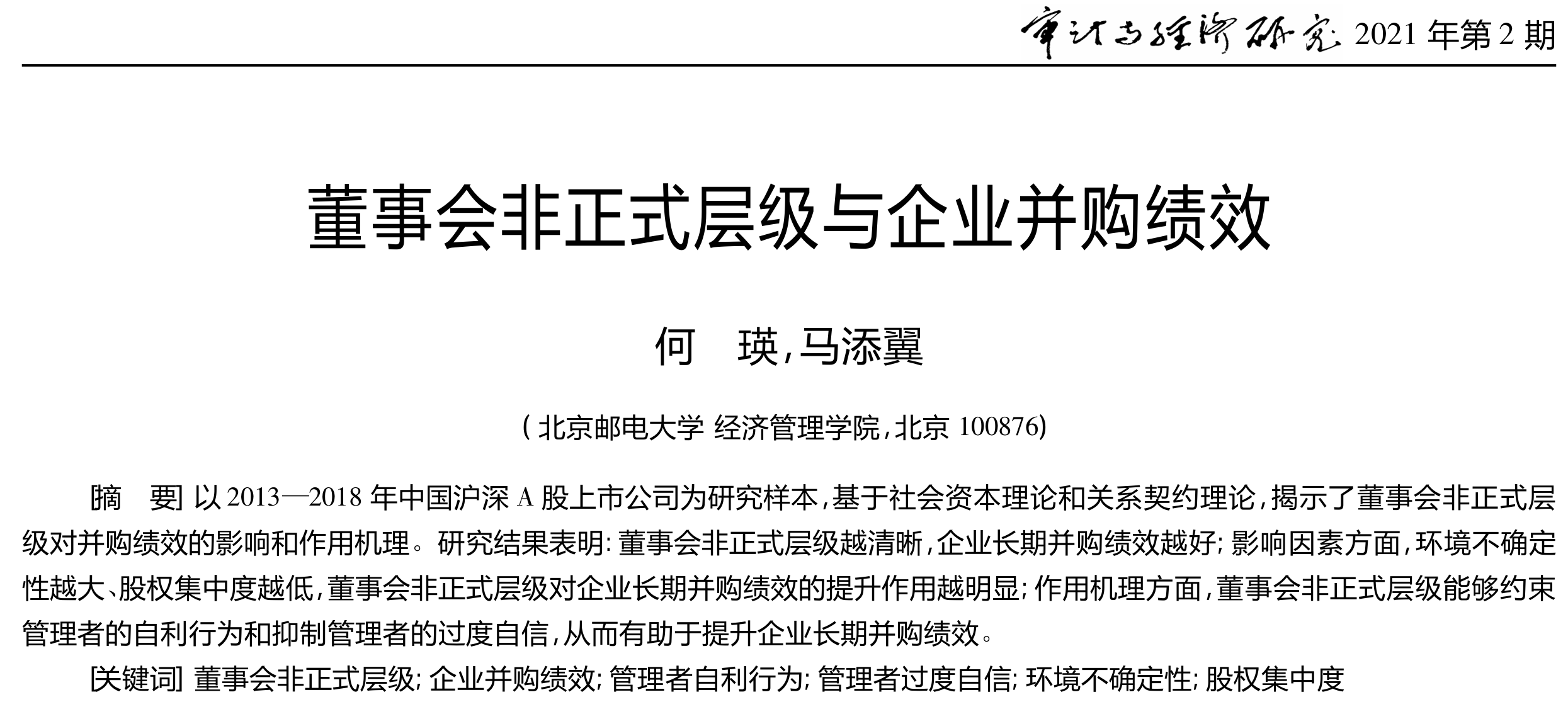 参考文献:[1]何瑛,马添翼.董事会非正式层级与企业并购绩效[J].审计与经济研究,2021,36(02):74-84.