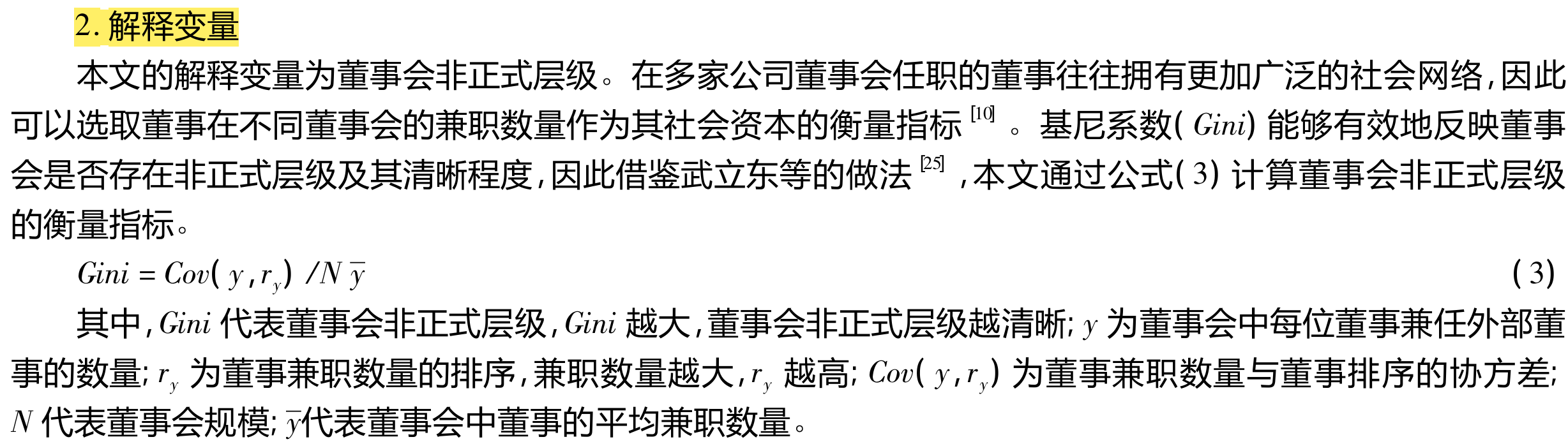 参考何瑛和马添翼(2021)的做法计算,在多家公司董事会任职的董事往往拥有更加广泛的社会网络,因此可以选取董事在不同董事会的兼职数量作为其社会资本的衡量指标。Gini代表董事会非正式层级,Gini越大,董事会非正式层级越清晰。