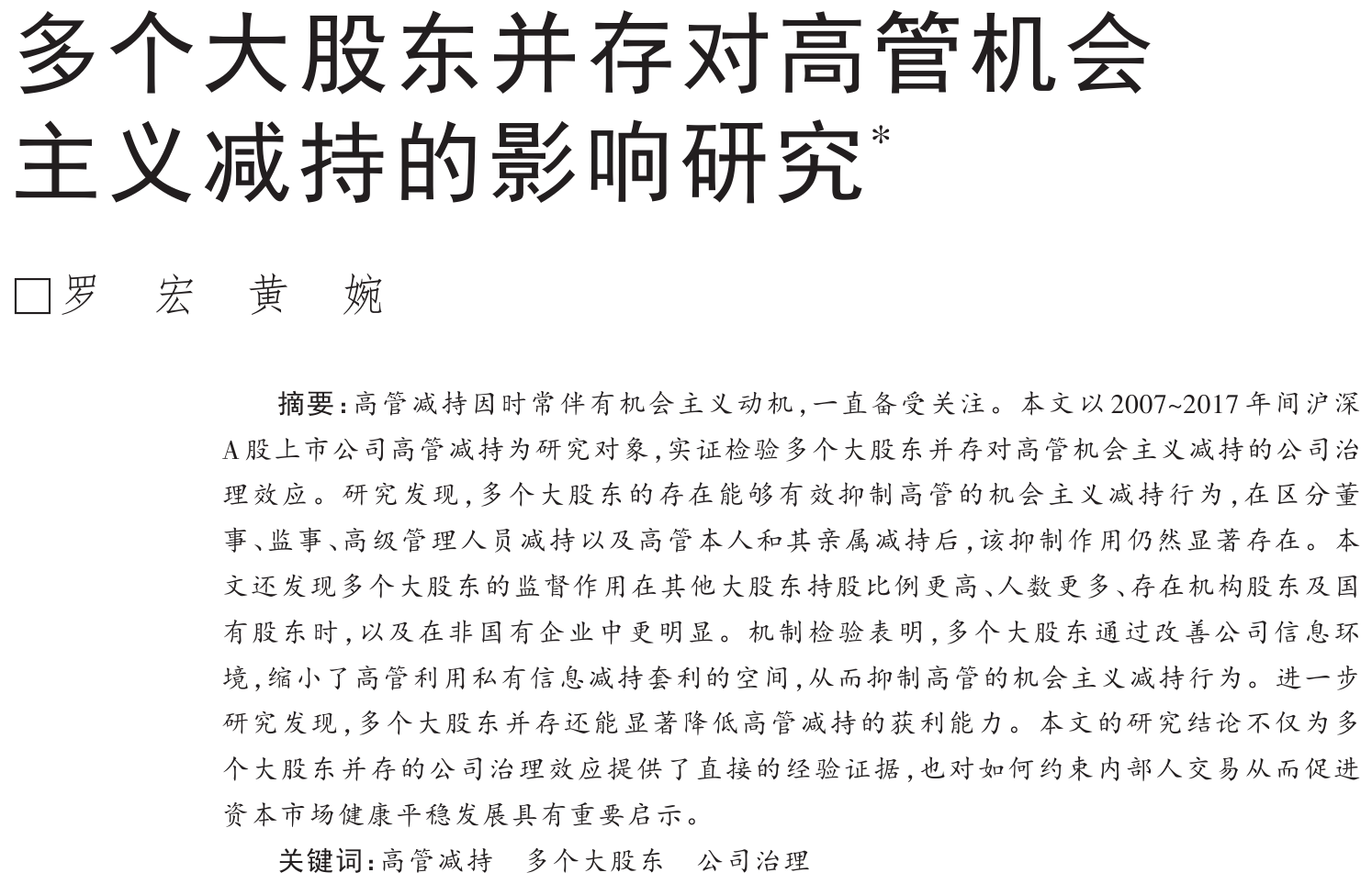 参考文献:[1]罗宏,黄婉.多个大股东并存对高管机会主义减持的影响研究[J].管理世界,2020,36(08):163-178.