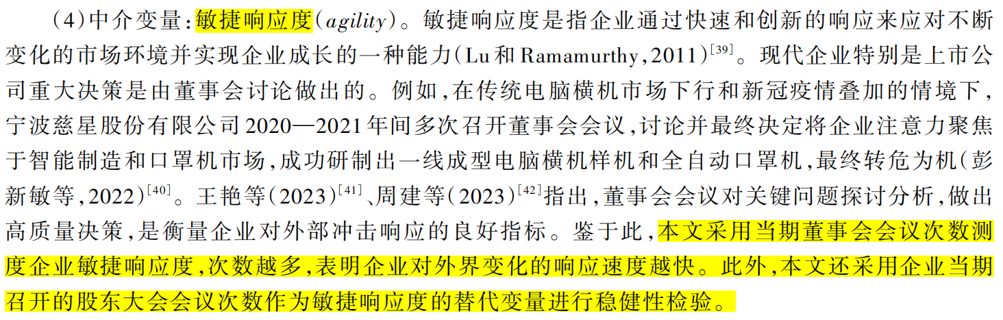 本文采用当期董事会会议次数测度企业敏捷响应度,次数越多,表明企业对外界变化的响应速度越快。此外,本文还采用企业当期召开的股东大会会议次数作为敏捷响应度的替代变量进行稳健性检验。 参考文献:[1]范合君,潘宁宁.数字化转型、敏捷响应度与企业韧性[J].经济管理,2024,46(07):36-54.