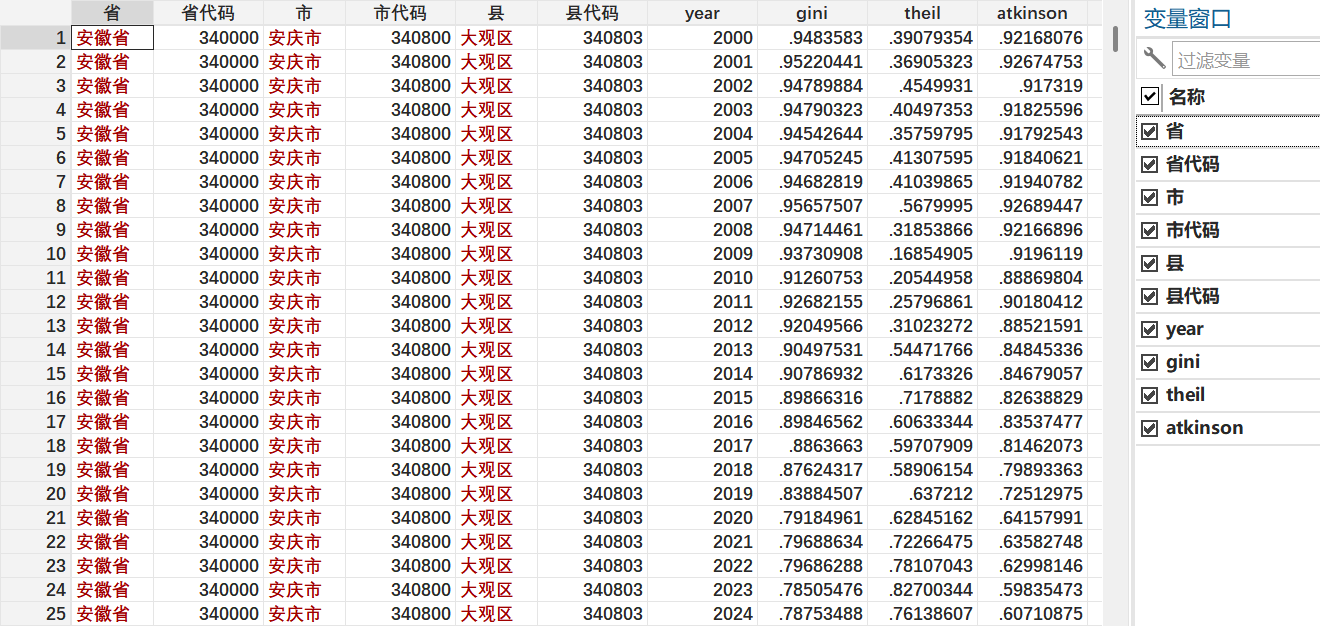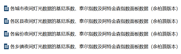 本数据集基于余柏蒗团队处理的NPP-VIIRS夜间灯光数据,计算了2000~2024年中国各省、市、区县、乡镇四级行政单元的基尼系数、泰尔指数和阿特金森指数,形成四套面板数据文件: