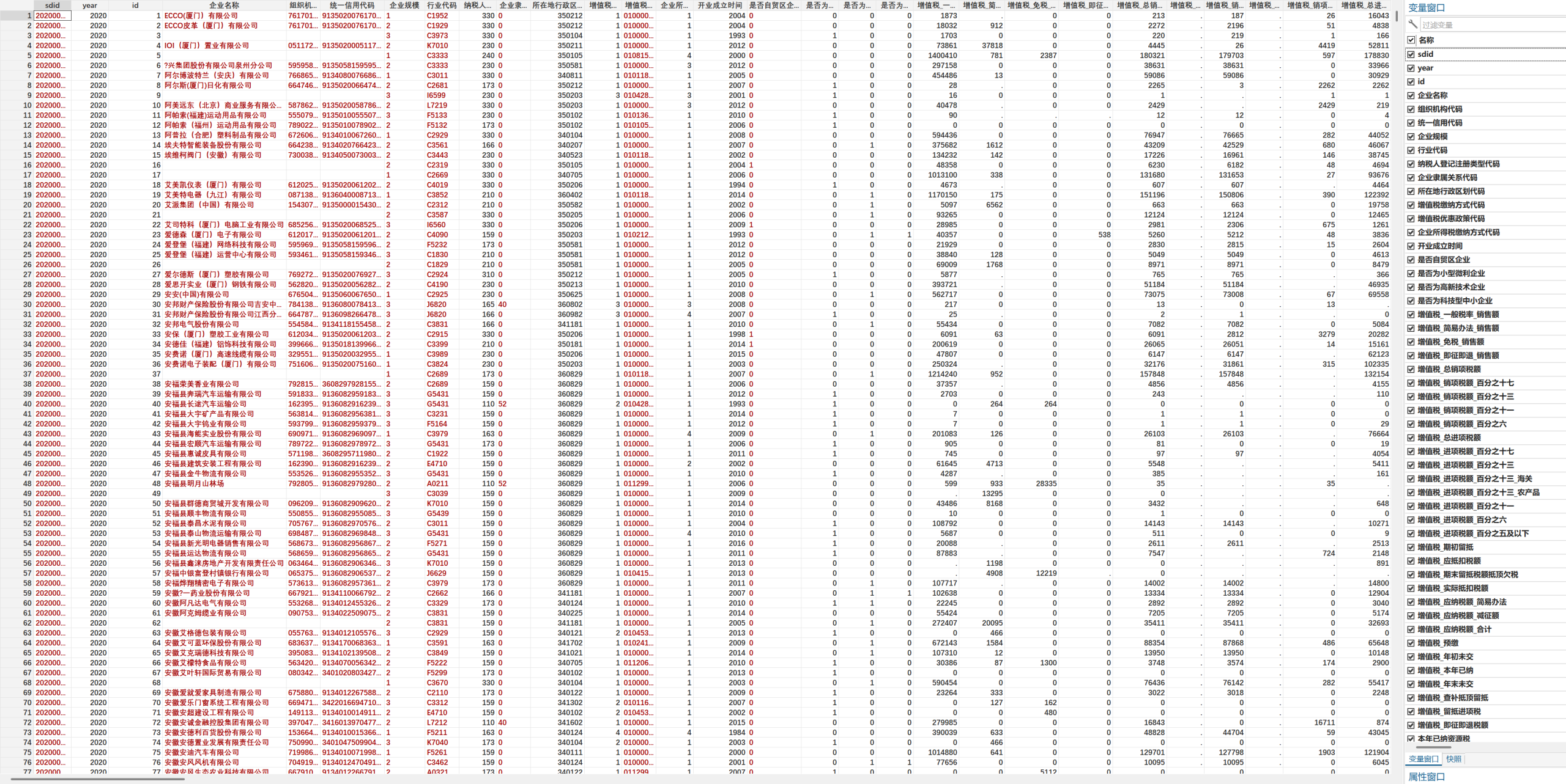 数据指标:sdid、year、id、企业名称、组织机构代码、统一信用代码、企业规模、行业代码、纳税人登记注册类型代码、企业隶属关系代码、所在地行政区划代码、增值税缴纳方式代码、增值税优惠政策代码、企业所得税缴纳方式代码、开业成立时间、是否自贸区企业、是否为小型微利企业、是否为高新技术企业、是否为科技型中小企业、增值税_一般税率_销售额、增值税_简易办法_销售额、增值税_免税_销售额、增值税_即征即退_销售额、增值税_总销项税额、增值税_销项税额_百分之十七、增值税_销项税额_百分之十三、增值税_销项税额_百分之十一、增值税_销项税额_百分之六、增值税_总进项税额、增值税_进项税额_百分之十七、增值税_进项税额_百分之十三、增值税_进项税额_百分之十三_海关、增值税_进项税额_百分之十三_农产品、增值税_进项税额_百分之十一、增值税_进项税额_百分之六、增值税_进项税额_百分之五及以下、增值税_期初留抵、增值税_应抵扣税额、增值税_期末留抵税额抵顶欠税、增值税_实际抵扣税额、增值税_应纳税额_简易办法、增值税_应纳税额_减征额、增值税_应纳税额_合计、增值税_预缴、增值税_年初未交、增值税_本年已纳、增值税_年末未交、增值税_查补抵顶留抵、增值税_留抵进项税、增值税_即征即退税额、本年已纳资源税、本年已纳城市维护建设税、本年已纳个人所得税、本年已纳印花税、本年已纳烟叶税、本年已纳车辆购置税、本年已纳各种行政事业性收费政府性基金、本年已纳各类社会保障性基金、养老保险、医疗保险、失业保险、工伤保险、生育保险、住房公积金、本年已纳其他收费、本年已纳各种税费滞纳金及罚款、营业收入、主营业务收入、营业成本、主营业务成本、营业税金及附加、销售费用、管理费用、研发费用、财务费用、资产减值损失、投资收益、营业利润、营业外收入、补贴收入、营业外支出、公益救济性捐赠、利润总额、所得税费用、净利润、年初总资产数、年初流动资产数、年初货币资金数、年初应收账款净额、年初存货数、年初非流动资产数、年初固定资产数、年末总资产数、年末流动资产数、年末货币资金数、年末应收账款数、年末存货数、年末非流动资产数、年末固定资产数、年末固定资产原值、年末固定资产累计折旧、年末固定资产净值、年初负债数、年初流动负债数、年初应付账款数、年初非流动负债数、年初长期借款数、年末负债数、年末流动负债数、年末应付账款数、年末非流动负债数、年末长期借款数、年初所有者权益数、年末所有者权益数、年末实收资本、年末资本公积、经营现金流入、销售现金流入、受到税收返还、经营现金流出、购买现金支出、支付员工薪水、支付税费、经营现金流净额、投资现金净额、筹资现金净额、汇率对现金影响、现金净增加额、外购设备、融资租赁设备、外购不动产、融资租赁不动产、本年增加固定资产、本年增加生产固定资产、本年增加生产建筑、本年增加生产进口设备、年末生产固定资产净值、年末生产建筑净值、年末生产进口设备净值、本年在建工程购入、本年计提折旧、本年设备折旧、本年房屋折旧、本年外购加工费、本年外购修理费、本年外购货运费、本年外购研发费、本年外购信息费、本年外购文创费、本年广告费、本年外购职工培训费、利息总支出、计提工资、年初职工数、年末职工数、特许使用费支出、企业总产值、企业增加值、电力消费量、煤炭消费量、油消费量、天然气消费量、水消费量、资产处置收益、其他收益、本年外购现代服务费、增值税_销项税额_百分之十七十六、增值税_销项税额_百分之十一十、增值税_进项税额_百分之十七十六、增值税_进项税额_百分之十一十、其他业务收入、其他业务成本、可供分配的利润、可供股东分配的利润、未分配的利润、有息负债、增值税_销项税额_百分之十六十三、增值税_销项税额_百分之十九、增值税_进项税额_百分之十六十三、增值税_进项税额_百分之十九、增值税_进项税额_百分之十九_海关、增值税_进项税额_百分之十九_农产品、可供分配利润、可供股东分配利润、未分配利润、年末收到留抵退税额、本年外购生活服务费、本年外购邮电通信费、本年外购土地使用权、本年外购其他无形资产、有息负债_银行、有息负债_其他金融机构、增值税_销项税额_百分之九、增值税_进项税额_百分之九、增值税_进项转出、增值税_实际抵减额、招待费用、外购原材料、外购加工费用、外购物流辅助服务。