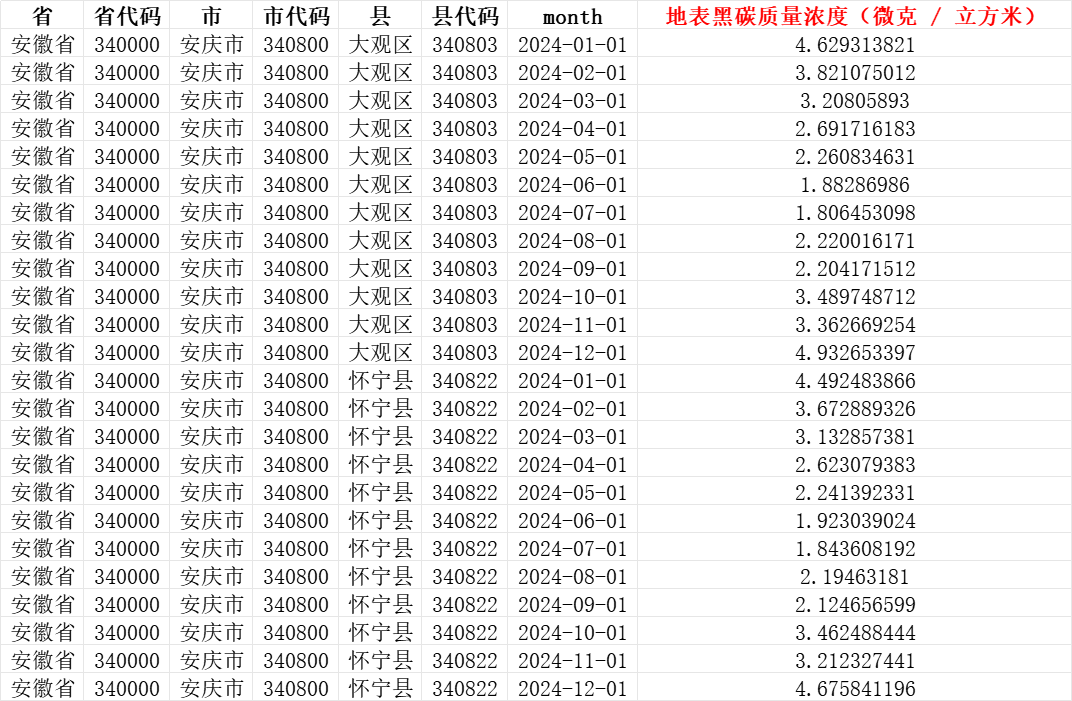 - 全国尺度:总观测值 540 个(45 年 ×12 个月),含 month、地表黑碳质量浓度 2 个核心变量,单位:微克 / 立方米;