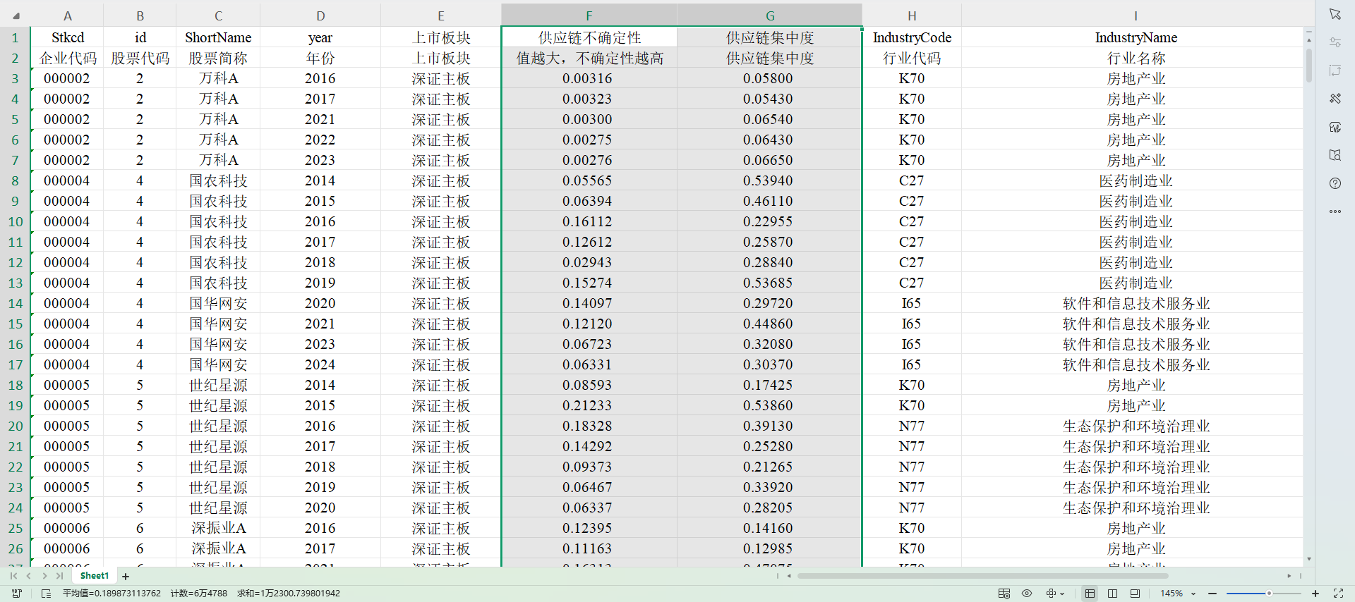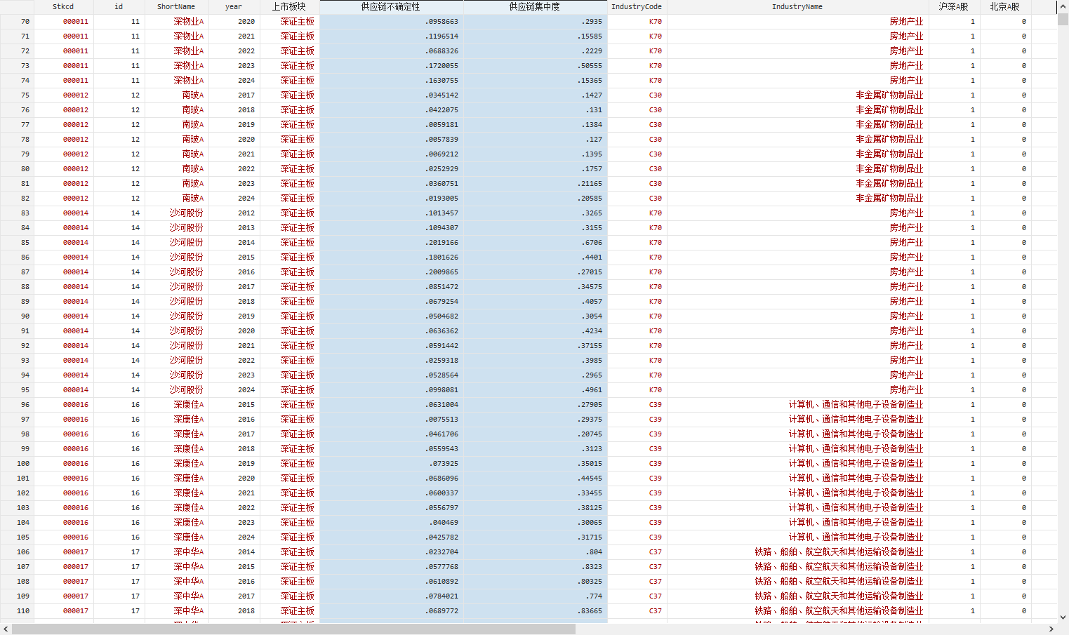 计算方法:复刻《科研管理》,使用 t-2 年至 t 年的供应链集中度的标准差衡量供应链不确定性。
