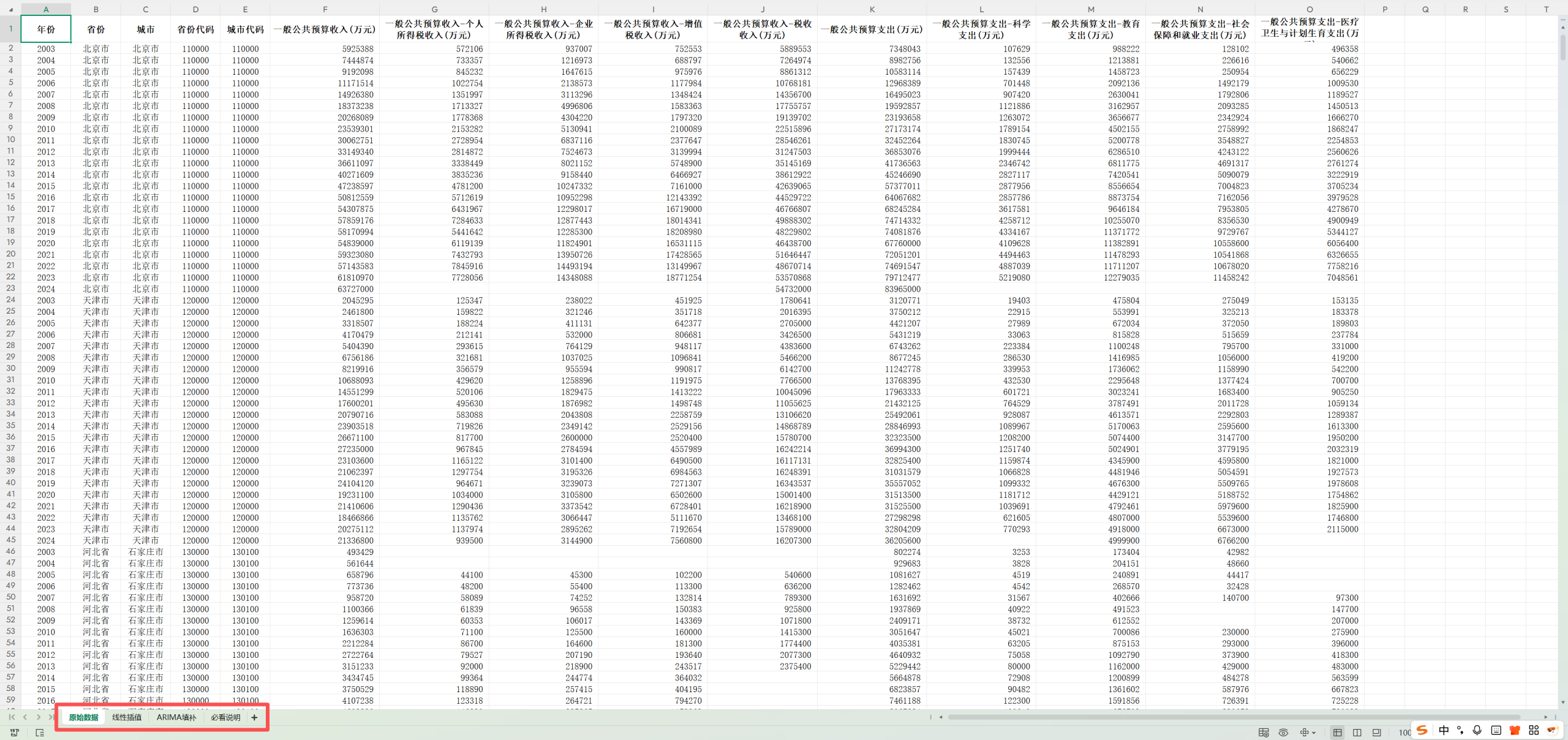 数据时间:2003-2024 数据范围:290+地级以上城市 数据样本:6535条 数据来源:各地方统计局 数据指标: 年份、省份、城市身份代码、城市代码、一般公共预算收入/支出个人所得税收入、企业所得税收入、增值税收入、税收收入、科学支出、教育支出、社会保障和就业支出、医疗卫生与计划生育支出。