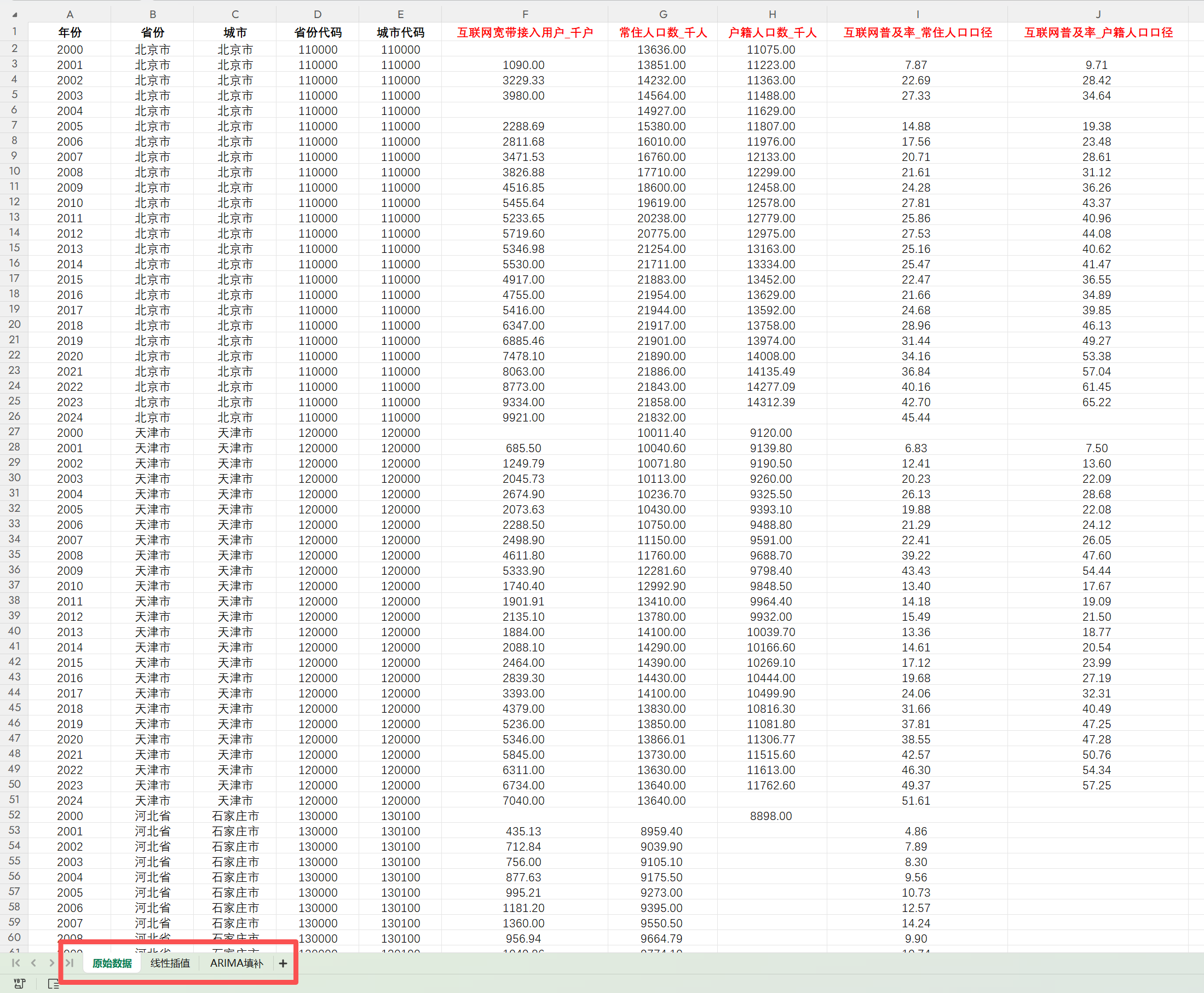 统计口径:地级市 数据来源:中国信息通信研究院、地方统计局 数据样本:共7450条观测值、298个城市 数据格式:单张Excel格式,含原始数据指标及计算结果,附原始/插值法/ARIMA三种结果;另有参考文献pdf。 数据指标:年份、省份、城市、省份代码、城市代码、互联网宽带接入用户_千户、常住人口数_千人、户籍人口数_千人、互联网普及率_常住人口口径、互联网普及率_户籍人口口径。