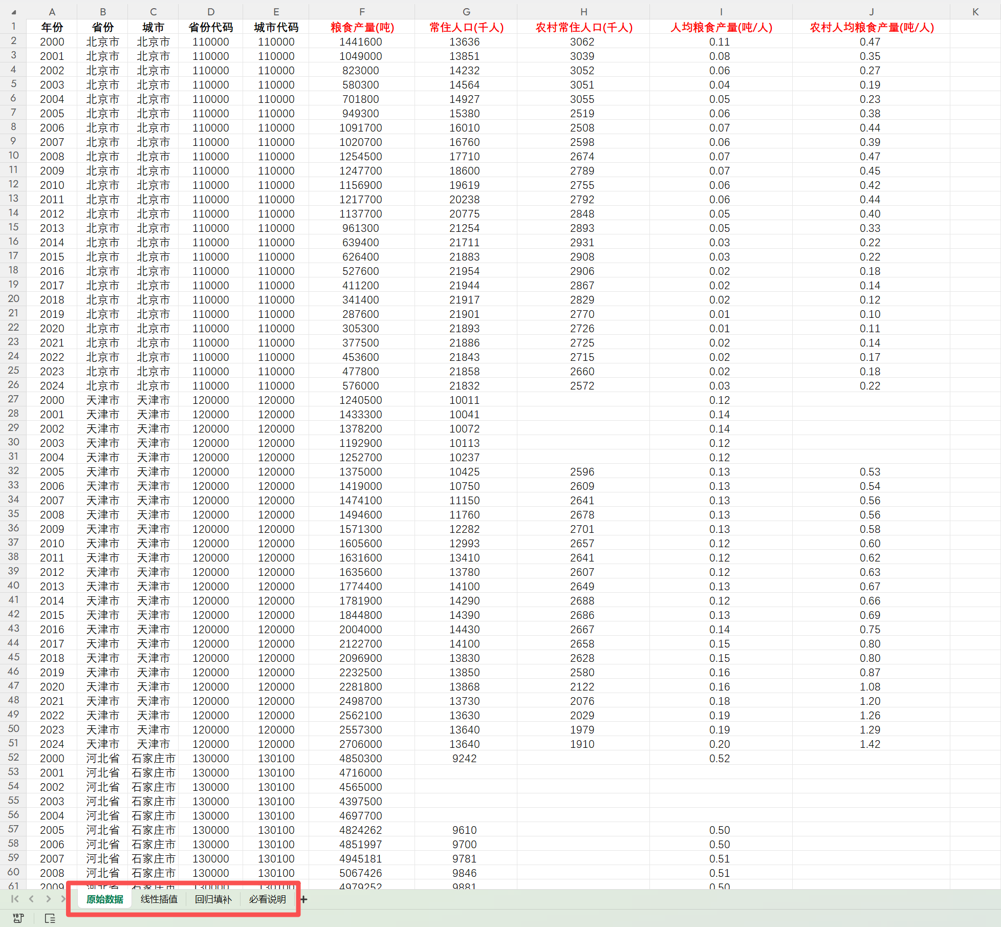 当前,我国人均粮食占有量已高于 400 公斤的国际粮食安全基准线,而粮食自给能力是衡量区域粮食安全状况的核心指标。本研究团队借鉴徐勇等(2024)、李卓等(2021)的研究方法,测算了 2000-2024 年各地级市粮食安全水平,并对地级市层面的人均粮食产量、农村人均粮食产量开展核算。具体核算公式为: