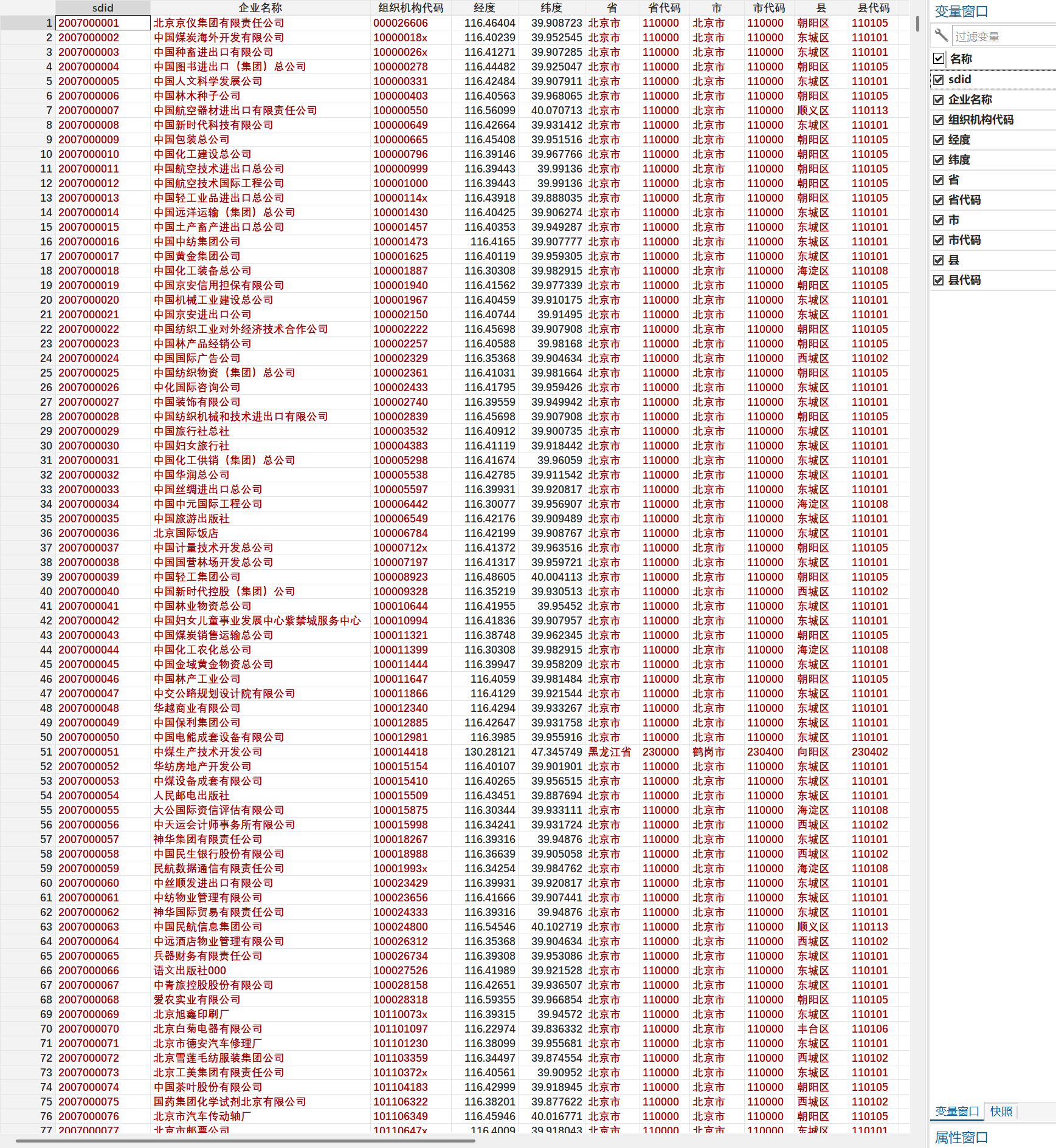 sdid(唯一识别码)、企业名称、统一社会信用代码、经度、纬度、所属行业代码、省、省代码、市、市代码、县、县代码。