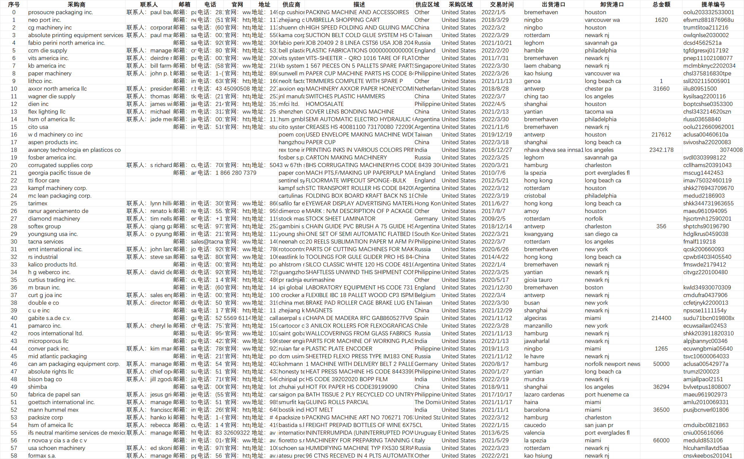 指标:采购商、联系人、邮箱、电话、官网、地址、供应商、描述、供应区域、采购区域、交易时间、出货港口、卸货港口、总金额、提单编号、公司名称、联系人、地址、邮箱、网址、联系方式、传真、名字、姓、邮箱、电话、社交账号、推特、学校、公司、职位、行业、国家、城市、详细地址、Linkedin 主页、公司网址。