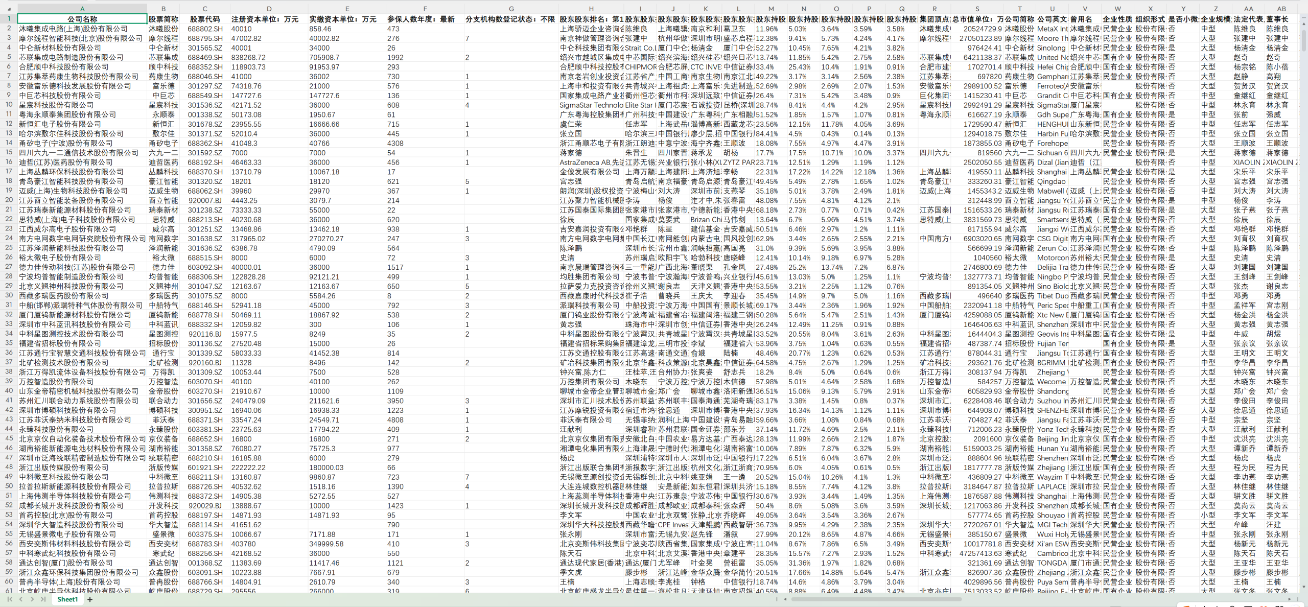指标:公司名称、股票简称、股票代码、注册资本(单位:万元)、实缴资本(单位:万元)、参保人数(年度:最新)、分支机构数(登记状态:不限)、股东(股东排名:第 1 大股东)、股东(股东排名:第 2 大股东)、股东(股东排名:第 3 大股东)、股东(股东排名:第 4 大股东)、股东(股东排名:第 5 大股东)、股东持股比例(股东排名:第 1 大股东)、股东持股比例(股东排名:第 2 大股东)、股东持股比例(股东排名:第 3 大股东)、股东持股比例(股东排名:第 4 大股东)、股东持股比例(股东排名:第 5 大股东)、集团顶点(集团户:不限)、总市值(单位:万元)、公司简称、公司英文名称、曾用名、企业性质、组织形式、是否小微企业、企业规模划型、法定代表人、董事长、总经理 / 行长、统一社会信用代码、组织机构代码、工商注册号、注册资本币种、实缴资本披露年度、登记状态、登记机关、成立日期、核准日期、营业期限起始日、营业期限截止日、吊销日期、注销日期、从业人数、从业人数披露年度、联系电话、电子邮箱、邮政编码、企业网址、注册地址、通信地址、经营范围、最新工商年报、实际控制人、是否央企、是否央企子公司、所属央企、所属央企持股比例、是否省级国企、是否市级国企、是否县 (区) 级国企、是否国企、国企级别、是否城投、是否城投子公司、所属城投、所属城投持股比例、是否上市公司子公司、所属上市公司、所属上市公司持股比例、是否上市、上市交易所、上市板块、上市日期、股票代码、股票简称、是否发债、是否只发公募债、是否只发私募债、是否有存续债、是否只有存续公募债、是否只有存续私募债、国标行业门类、国标行业大类、国标行业中类、国标行业小类、国标行业门类代码、国标行业大类代码、国标行业中类代码、国标行业小类代码、申万一级行业、申万二级行业、申万三级行业、所属省、所属市、所属区 / 县、所属乡镇 / 街道、所属省代码、所属市代码、所属区 / 县代码、所属乡镇 / 街道代码、所属园区。