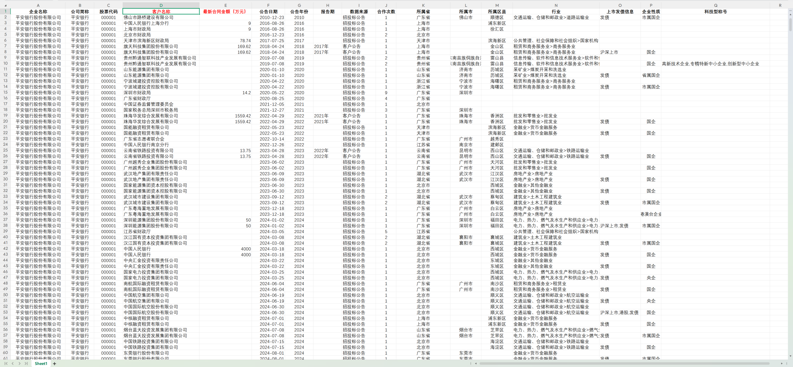 通过对上市公司的 招标公告、公司公告、客户公告 三大渠道整理提取出上市公司客户数据集,原始数据样本 47万+ 条,包括但不限于客户名称、最新合同金额(万元)、公告日期、年份、合作次数、所属省、所属市、所属区县、行业、企业性质等指标。