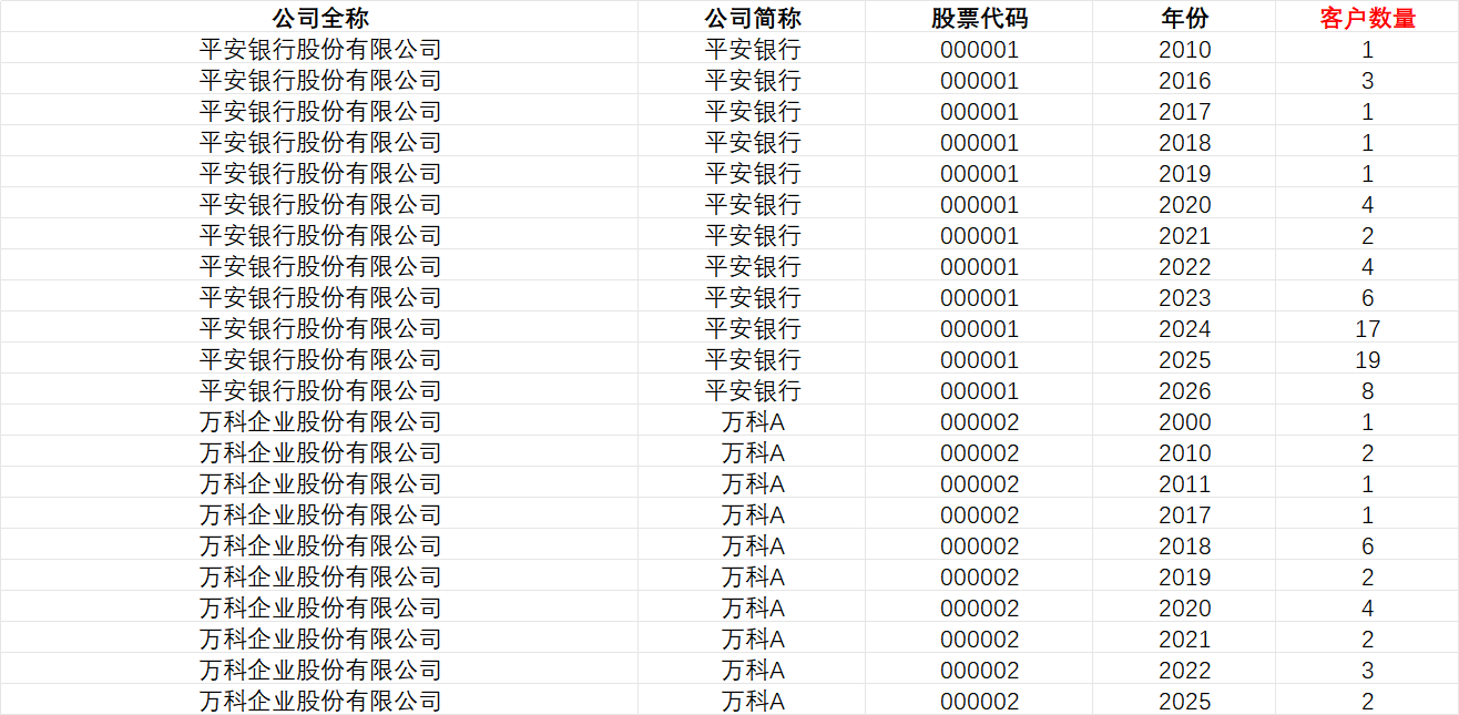 最后对原始数据进行统计,计算出上市公司每年的客户数量,这仅是通过对年份与数量的计算,其实还可根据上市公司与客户间地理位置进行匹配计算。对于年份与客户数量的计算,在统一年份中可能存在同一个客户与之合作多次的情况,但是都被计算为 1 次。如果有需要也可根据指标计算出企业与客户间的合作次数。