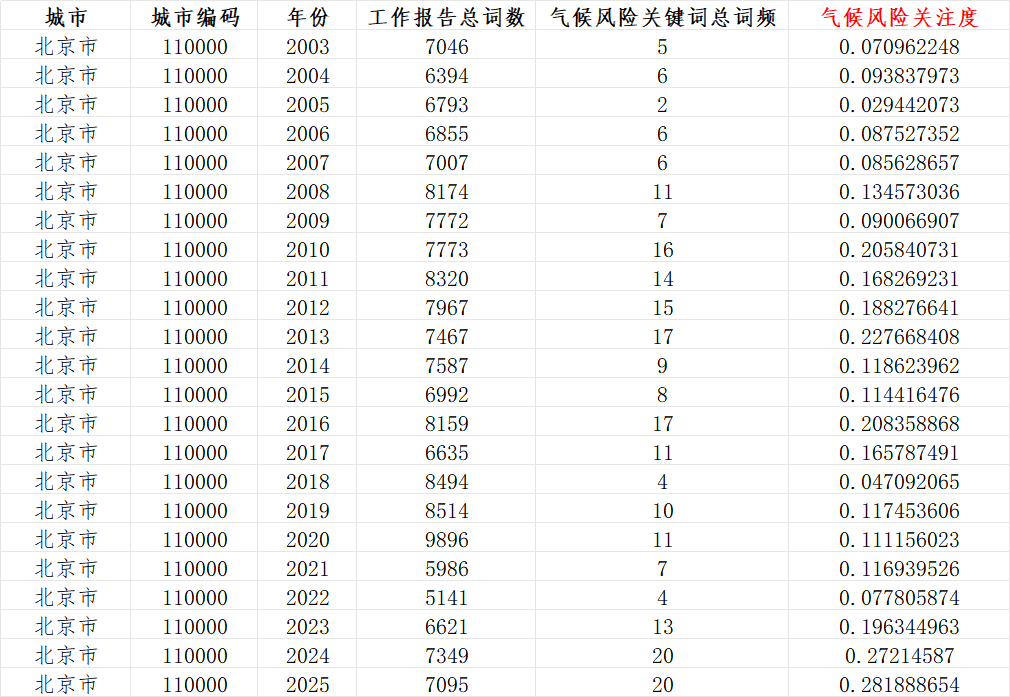 参考文献以上文献方式,通过文本分析来测算政府气候风险关注度。具体而言,对特定的气候物理风险(例如,高温、暴雨、洪涝、内涝、干旱、山体滑坡、泥石流、极端天气等)与气候转型风险(可持续、低碳、清洁能源、碳达峰、碳中和、搁浅资产、环境披露、环境监管、碳交易等)的关键词出现频率进行加总,以量化政府工作报告中体现的对气候风险关注程度!