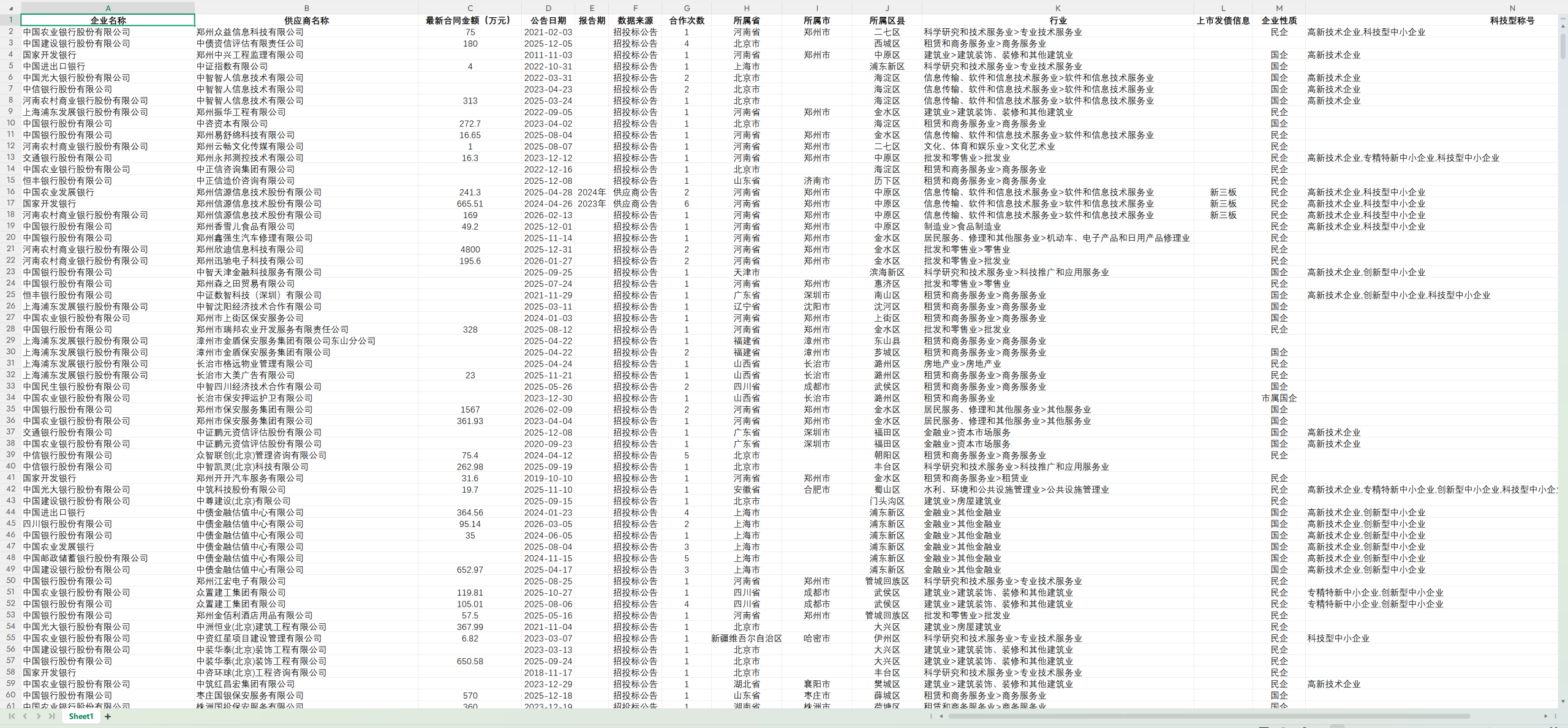 供应商:企业名称、供应商名称、最新合同金额(万元)、公告日期、公告年份、报告期、数据来源、合作次数、所属省、所属市、所属区县、行业、上市发债信息、企业性质、科技型称号