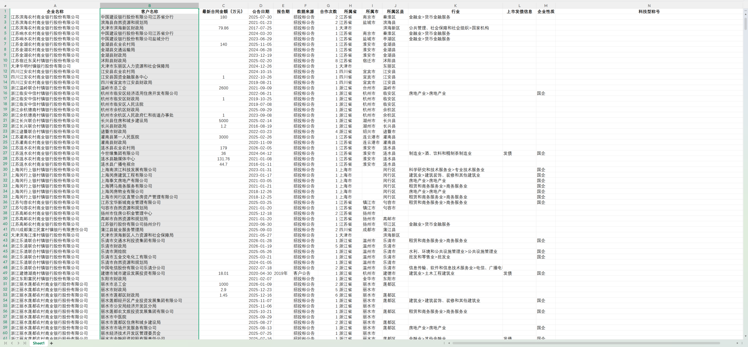 客户:企业名称、客户名称、最新合同金额(万元)、公告日期、公告年份、报告期、数据来源、合作次数、所属省、所属市、所属区县、行业、上市发债信息、企业性质、科技型称号
