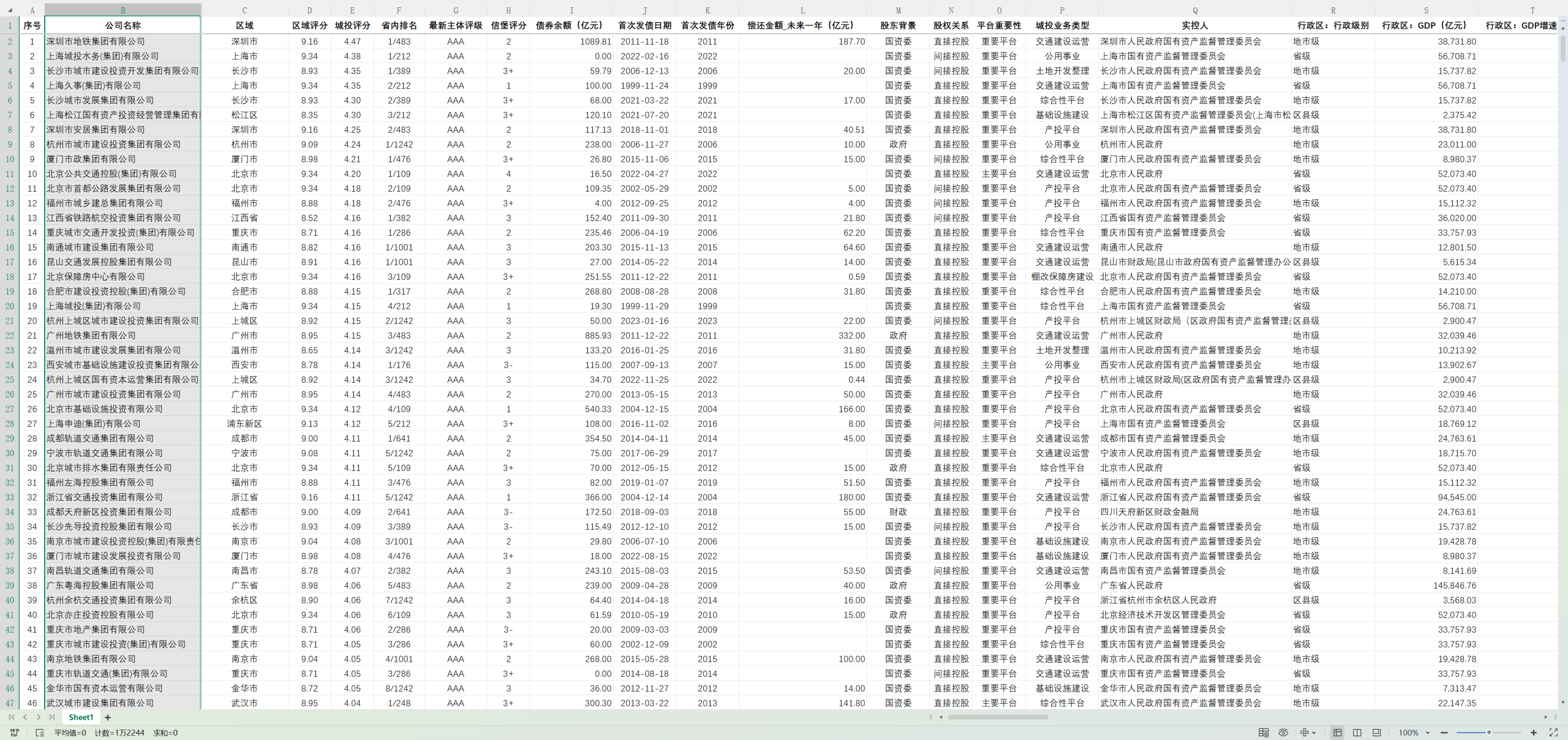 数据指标:1、序号、2、公司名称、3、区域、4、区域评分、5、城投评分、6、省内排名、7、最新主体评级、8、信堡评分、9、债券余额(亿元)、10、首次发债日期、11、首次发债年份、12、偿还金额_未来一年(亿元)、13、股东背景、14、股权关系、15、平台重要性、16、城投业务类型、17、实控人、18、行政区:行政级别、19、行政区:GDP(亿元)、20、行政区:GDP 增速(%)、21、行政区:一般公共预算收入(亿元)、22、行政区:政府性基金收入(亿元)、23、行政区:债务率(宽口径)(%)、24、行政区指标年份、25、开发区:所属开发区、26、开发区:开发区类别、27、开发区:GDP(亿元)、28、开发区:一般公共预算收入(亿元)、29、开发区:债务率(宽口径)(%)、30、开发区指标年份、31、平台口径、32、银保监会口径、33、华西固收口径、34、国金固收口径、35、华创固收口径、36、华泰固收口径、37、财通固收口径、38、最新报告期、39、总资产(亿元)、40、净资产(亿元)、41、货币资金(亿元)、42、土地资产(亿元)、43、受限资产(亿元)、44、应收账款(亿元)、45、其他应收款(亿元)、46、公益性 & 准公益性主营占比(%)、47、应收类款项来自政府占比(%)、48、政府补助(亿元)、49、专项应付款(亿元)、50、营业收入(亿元)、51、归母净利润(亿元)、52、净资产收益率(%)、53、经营现金流量净额 (亿元)、54、筹资现金流量净额(亿元)、55、投资现金流量净额(亿元)、56、总负债(亿元)、57、有息债务(亿元)、58、有息债务 / 总负债(%)、59、资产负债率(%)、60、综合融资成本(%)、61、有息债务合计 – 年报(亿元)、62、公司信用类债券 – 年报(亿元)、63、银行贷款 – 年报(亿元)、64、非银行金融机构贷款 – 年报(亿元)、65、其他有息债务 – 年报(亿元)、66、现金比率、67、现金流量比率、68、现金到期债务比、69、授信余额(亿元)、70、授信余额 / 全部债务(%)、71、EBITDA 保障倍数、72、是否发债、73、私募债余额占比(%)、74、一年内到期债券占比(%)、75、债券余额 / 有息债务(%)、76、借款(亿元)、77、借款 / 有息债务(%)、78、非标余额(亿元)、79、非标余额 / 有息债务(%)、80、对外担保金额(亿元)、81、对外担保比例(%)。