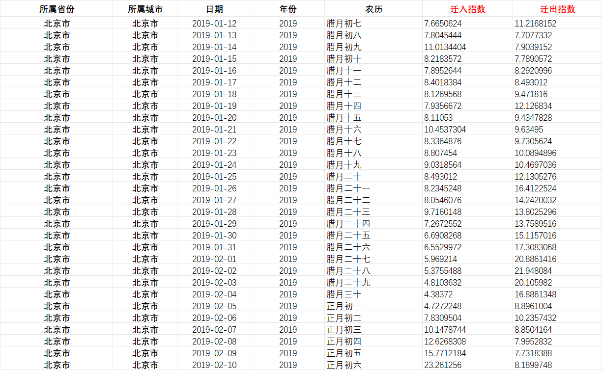 中国城市春节人口迁徙指数(2019-2025) 迁徙指数:是利用位置大数据构建的人口流动监测体系。通过分析用户地理位置变化,量化呈现不同城市间的人口迁移规模与流向特征。该指数包含迁入、迁出两大核心指标,支持全国367个城市间的横向对比分析。春节期间(腊月、正月)地级市人口迁徙指数数据,为研究城市间人口流动规律提供数据支撑。 数据名称:春节地级市人口迁徙指数 数据年份:2019-2025 数据来源:百度迁徙平台 数据范围:367个城市(含直辖市)